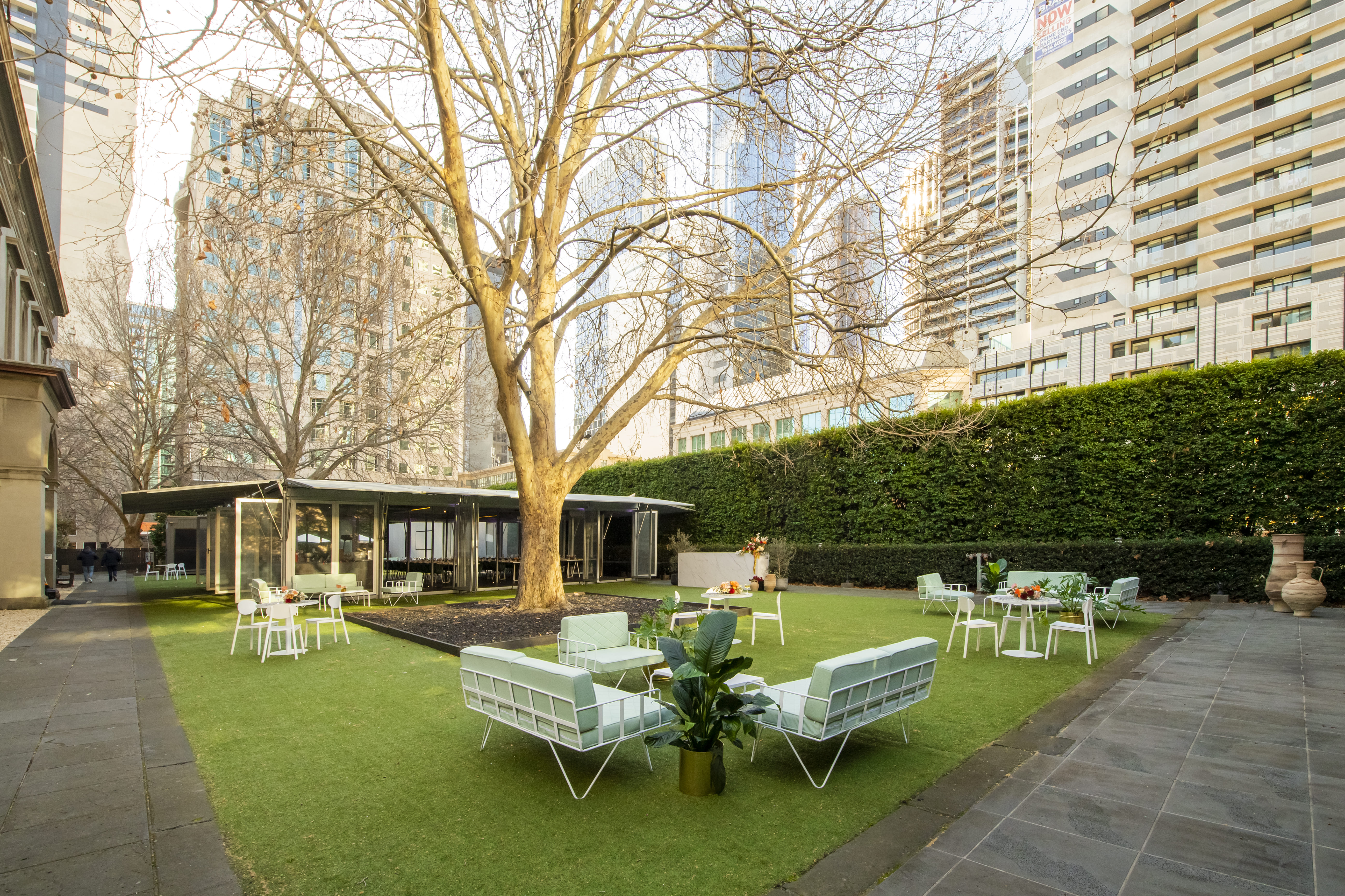 The Hellenic Museum was founded in 2007, with a mission to inspire Australians about Hellenic culture from the ancient to the contemporary. The Hellenic Museum was founded by the late Melbourne businessman and philanthropist Spiros Stamoulis . Having emigrated from Greece to Australia as a 12 year old in the 1950s, Spiros went on to build a series of successful businesses which enabled him to give back to the city which had embraced both him and his family. The former Royal Mint is of architectural significance as one of the most impressive 19th century government buildings in Victoria, and one of few Australian buildings in the true Renaissance revival style, and a virtual copy of the Palazzo Vidoni Caffarelli , attributed to Raphael, in Rome. Sean Godsell ‘s much anticipated M Pavilion officially opened to the public on 7 October 2014. Now having been permanently relocated from the Queen Victoria Gardens to the Hellenic Museum courtyard, the structure is intended to be reminiscent of the Aboriginal humpy, both in form and function. It is a place to gather, converse and connect. And it still serves that purpose today. With a combined capacity for 500 cocktail, including wet weather coverage for up to 200 guests, it provides a secluded secret garden in the heart of the CBD. A fully integrated bar, and kitchen facility ensure a high level of service whatever your style of event. Eastern Courtyard & M Pavilion is perfect for: Cocktail Party venue Melbourne | Birthday venue Melbourne | Wedding venue Melbourne | Engagement party venue Melbourne | Private Dining Room Melbourne | Networking venue Melbourne | Corporate Function venue Melbourne | Christmas Party venue Melbourne