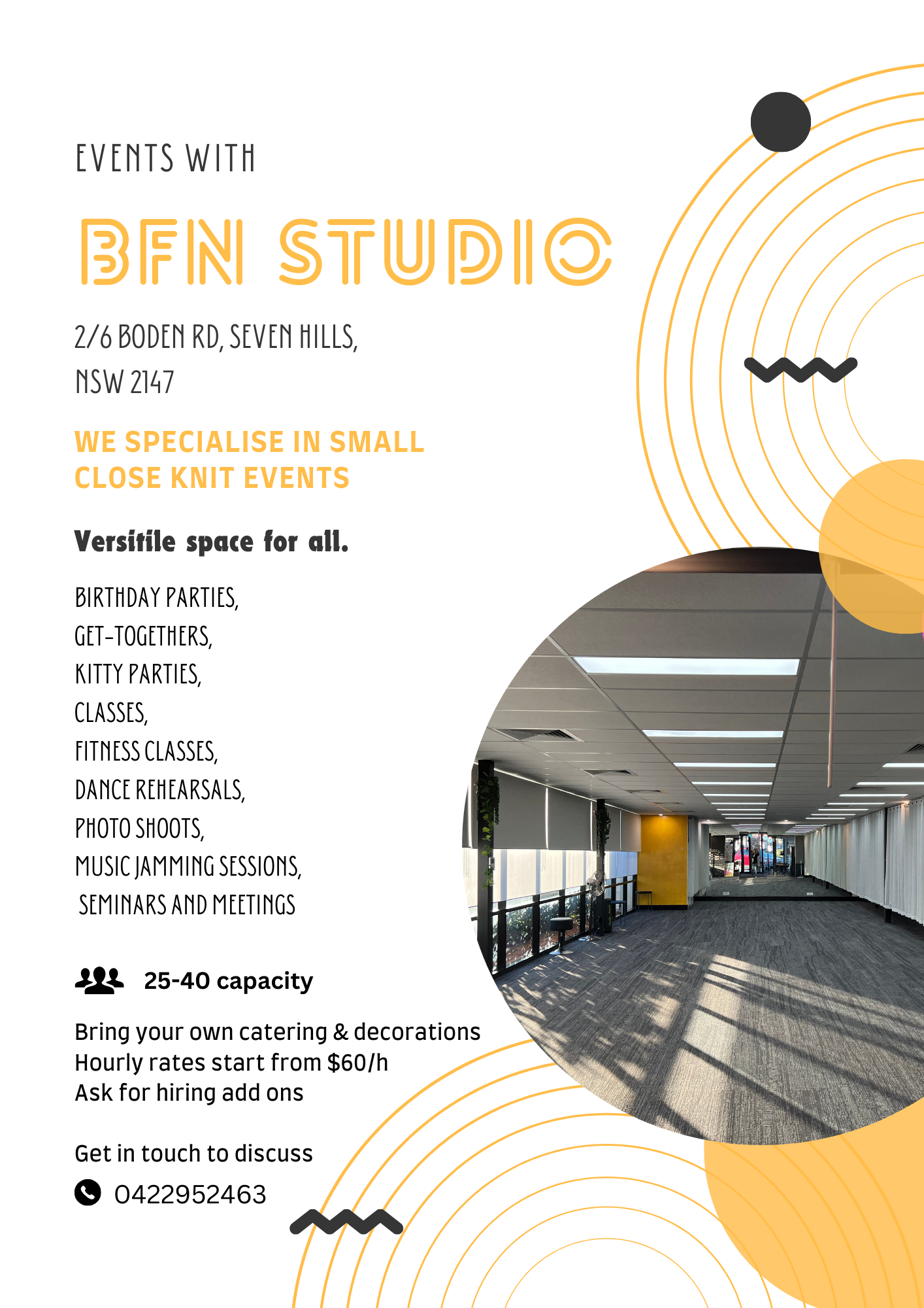 BFN Studio is an approx. 100 sqm studio space in Seven Hills, just off the Old Windsor road. This venue boasts a convenient location with ample parking. The hall has carpeted floors & big windows for natural light. Mirrors, aircon & a music system are also installed. This versatile space is suitable for various occasions like birthday parties, get-togethers, classes and fitness classes, dance rehearsals, photo shoots, music jamming sessions, and other events, including seminars and meetings. When it comes to parties, there are no restrictions or obligations. You have the freedom to make your own arrangements for catering and decorations, or if you prefer, BFN Studio can arrange. Please kindly note that no alcohol is allowed in this venue. BFN Studio is perfect for: Birthday venue Sydney | Baby shower venue Sydney | Studio venue Sydney | Workshop venue Sydney | Meeting room Sydney | Presentation venue Sydney | Christmas Party Venue Sydney