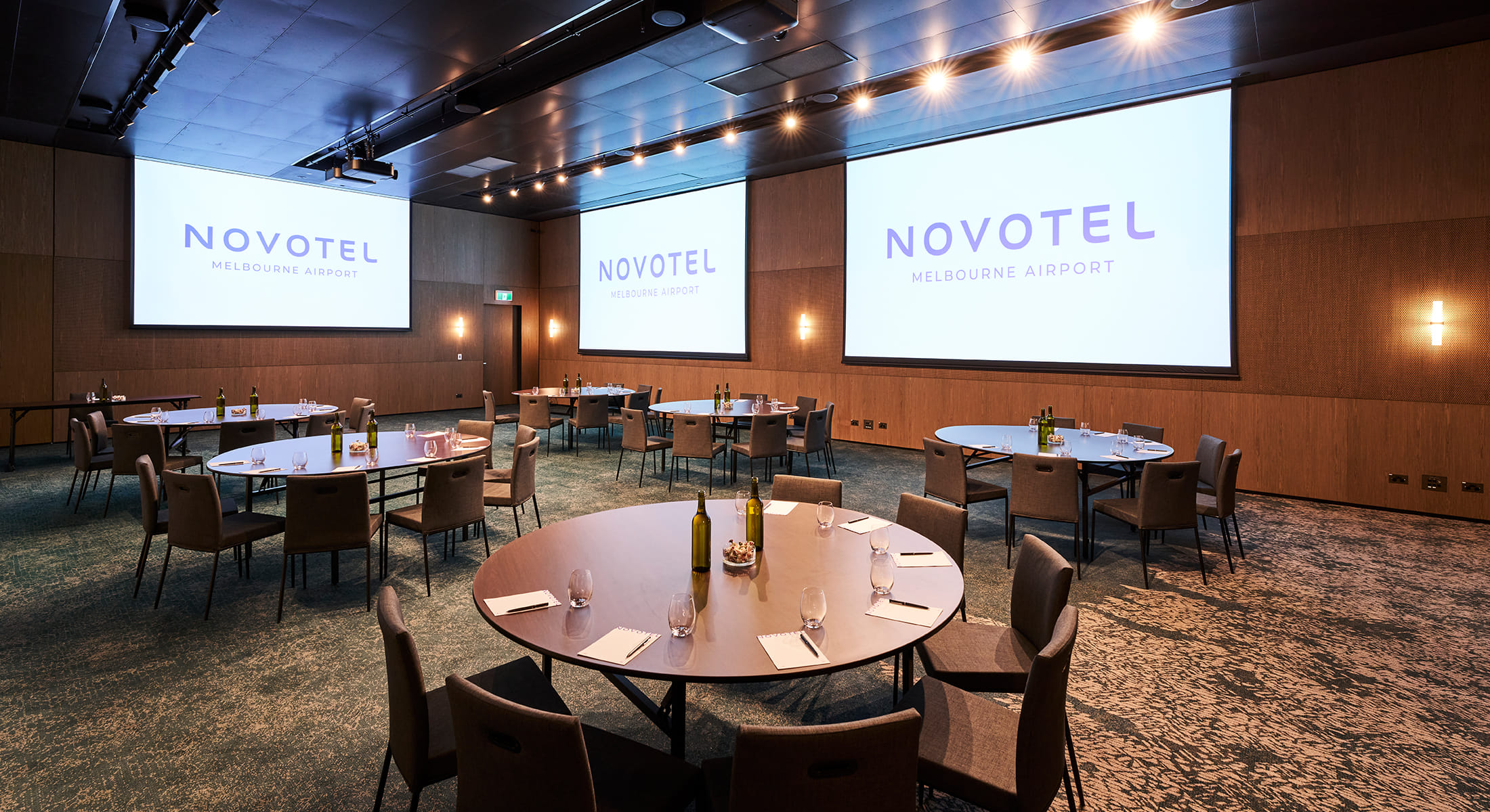 The exquisite, pillar-less Ballroom is the largest Ballroom in the Melbourne Airport precinct which offers a blend of sophistication and versatility. This elegant space features three expansive conference rooms that seamlessly merge into one grand ballroom, complete with impressive 4m high ceilings and state-of-the-art lighting and audiovisual equipment. The Ballroom can be divided into three separate sections making it ideal for breakout sessions or more intimate gatherings. Accommodating up to 330 guests in a theatre-style setup or 240 in a banquet style arrangement, the Ballroom ensures ample space for attendees to engage and connect. Inspired by the Great Ocean Road, its design theme creates a unique and memorable ambiance for any event. Whether hosting a conference, gala, or corporate event, the Ballroom provides a perfect blend of elegance and functionality, offering a stunning backdrop for a seamless and unforgettable experience. Main Ballroom is perfect for: Workshop venue Melbourne | Meeting room Melbourne Networking venue Melbourne | Conference venue Melbourne | Corporate Function venue Melbourne | Christmas Party venue Melbourne | Weddings
