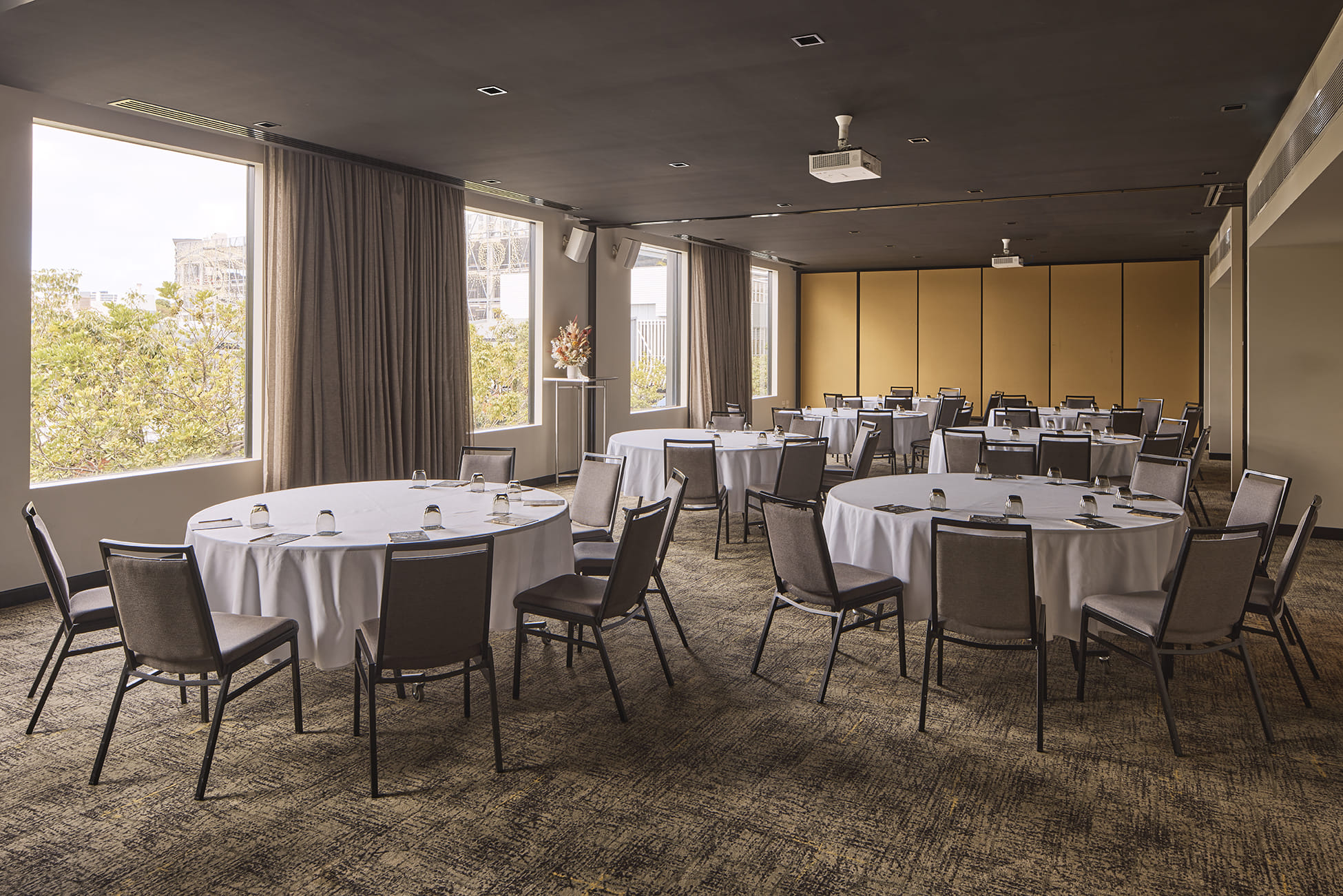 Situated at 601 Gregory Terrace in Brisbane’s lively King Street precinct, Rydges Fortitude Valley sits next to the Brisbane Showgrounds and Royal International Convention Centre. Its interiors fuse modern elegance with rustic charm, featuring natural tones and design elements inspired by the area's agricultural roots. Podium 2 and Podium 3 at Rydges Fortitude Valley offer a combined event space of 160 m², perfect for medium-sized gatherings and functions. Podium 2 is a 55 m² pillarless room with abundant natural light and advanced audiovisual equipment, including an 87-inch HD projector screen and built-in sound systems. Podium 3 spans 105 m² and features similar modern AV technology with a large HD projector screen, making it ideal for presentations and events. Together, they can host up to 110 guests in theatre style, 70 for banquets, 54 classroom-style, 80 for cocktail events, providing versatile layouts to accommodate a variety of event types. Podium 2 and 3 is perfect for: Cocktail Party venue Brisbane | Workshop venue Brisbane | Meeting room Brisbane | Presentation venue Brisbane | Networking venue Brisbane | Conference venue Brisbane | Corporate Function venue Brisbane | Christmas Party Venue Brisbane