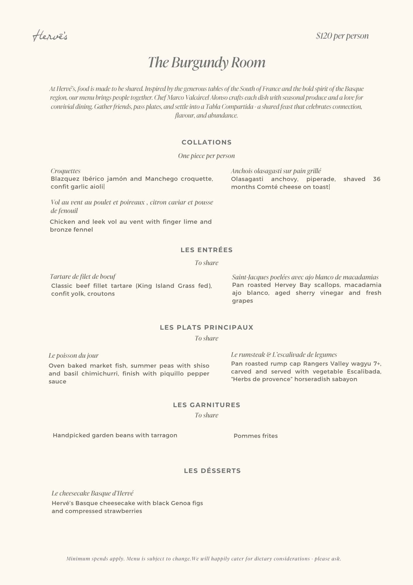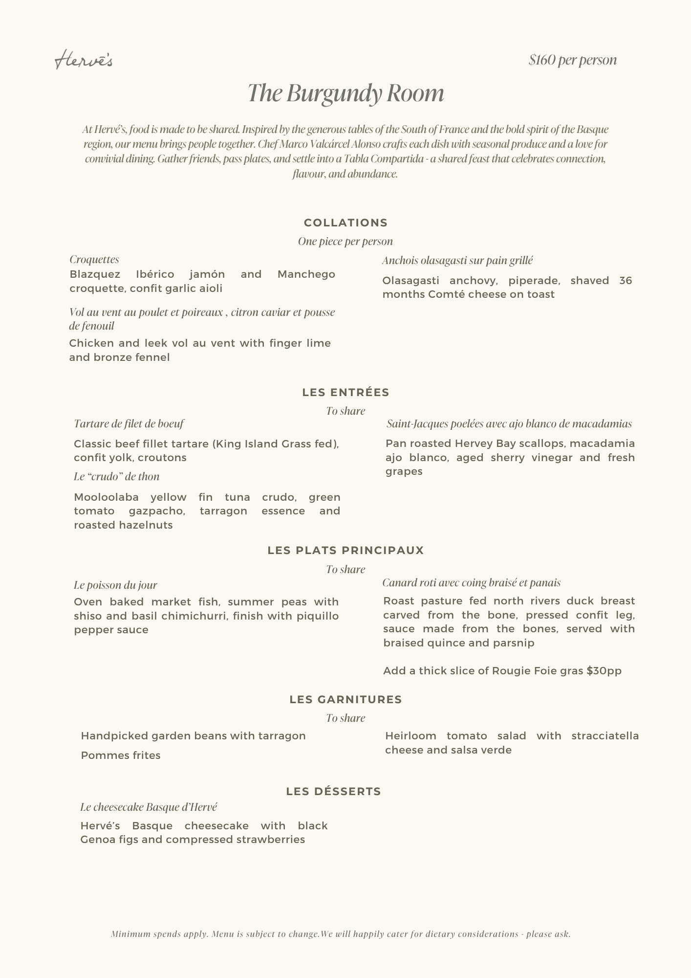 Perched on the third floor, the Burgundy room offers a serene escape, overlooking our main dining area with breathtaking skyline views of the city. Comfortably accommodating up to 14 to 16 guests, it’s the ideal setting for your next event. With a dedicated staff member to look after you, our Private Dining Room provides a true, premium experience. The Elegance Menu offers complete freedom to choose from our full range of dishes, from aperitifs through to dessert and fromage. This is the pinnacle of indulgence - a shared menu experience designed for those seeking the very finest in private dining. The Signature Menu is a curated three-course shared dining experience at $120 per guest. Thoughtfully designed by our kitchen team, this shared menu showcases the essence of our cuisine, offering both refinement and exceptional value. A great option for corporate groups. The Burgundy Room is available Wednesday to Saturday (Lunch & Dinner). We will happily cater for dietary requirements.