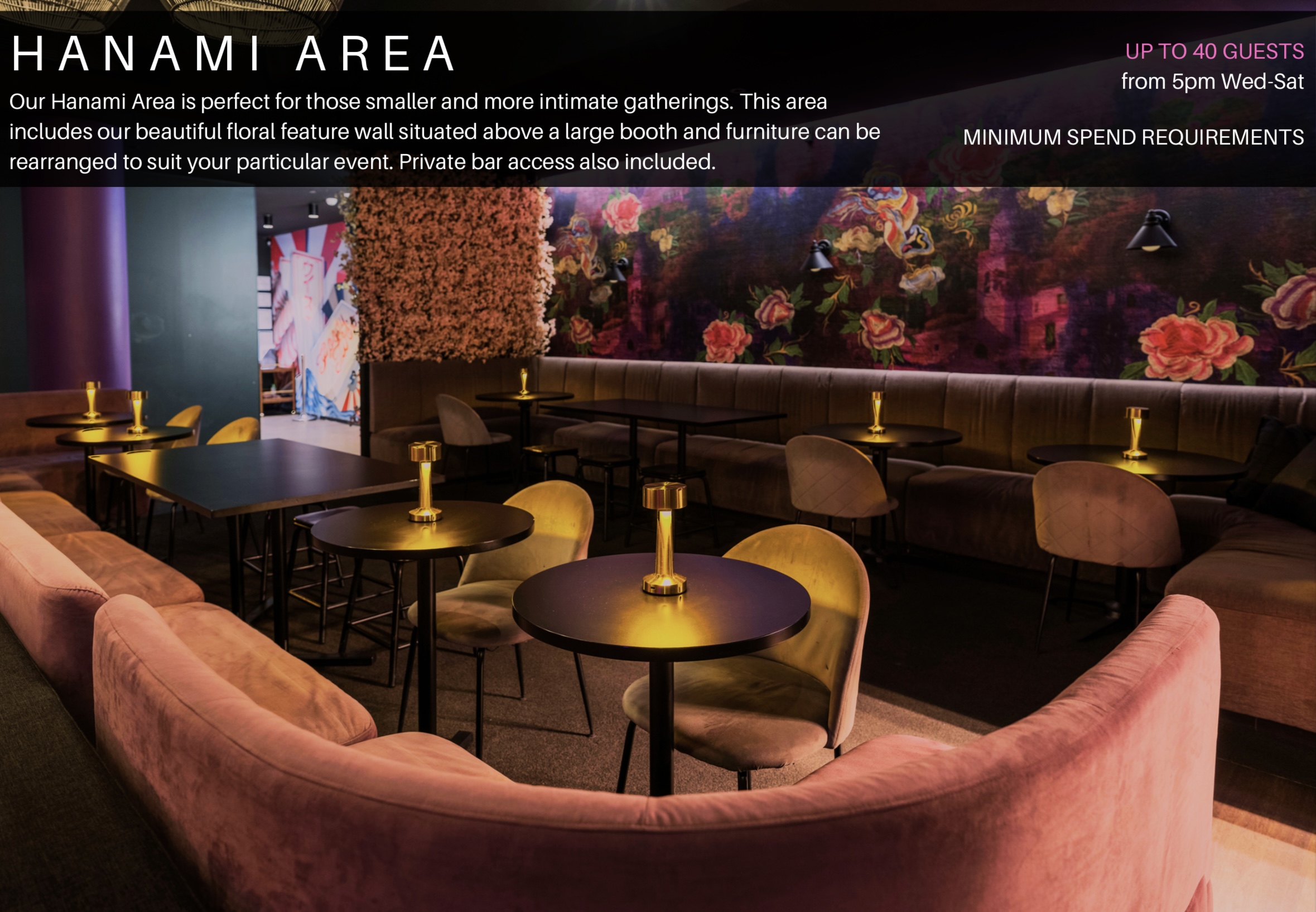 Goody Twos is located in the heart of Perth’s CBD, Western Australia, and is renowned as a lively Japanese-inspired late-night bar. Known for its playful energy and vibrant atmosphere, the venue combines modern design with touches of Tokyo nightlife flair, offering a unique setting that blends neon accents, intimate lighting, and contemporary décor. It’s a go-to destination for guests seeking carefully crafted cocktails, curated spirits, and a buzzing social vibe that runs late into the night. Within the venue, the Hanami Area provides a stylish and semi-private space designed for group gatherings and special events. Inspired by the beauty of cherry blossom season, this area carries a warm and inviting ambiance with its soft lighting and Japanese-inspired aesthetic. With a capacity to accommodate up to 60 guests, it’s ideal for birthdays, corporate functions, or social celebrations that call for a dedicated setting. Guests can enjoy tailored drink packages and share-style menus, all while being immersed in the lively backdrop of Goody Twos’ signature nightlife atmosphere. Hanami Area is perfect for: Cocktail Party venue Perth | Birthday venue Perth | Wedding venue Perth | Team activity venue Perth | Engagement party venue Perth | Private Dining Room Perth | Networking venue Perth |