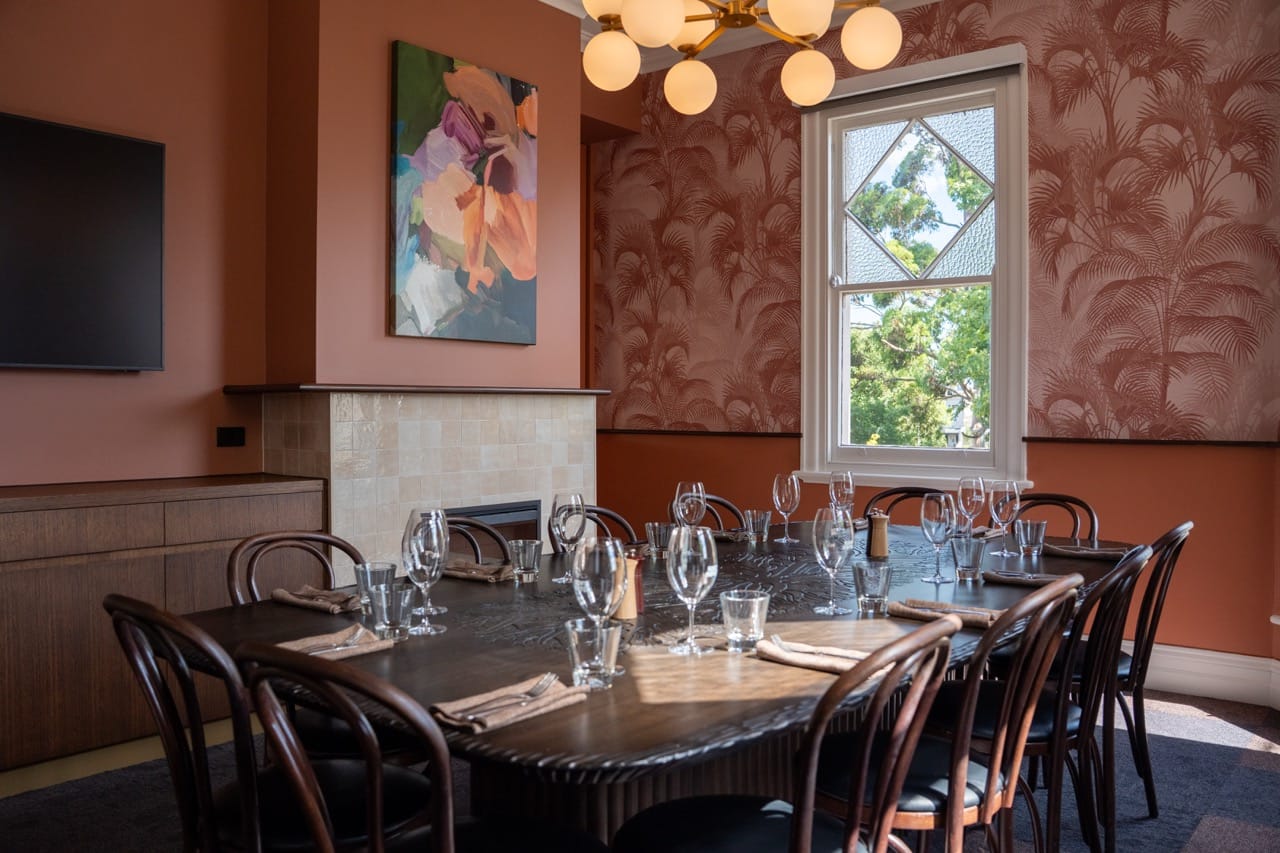 Kent Hotel is a contemporary neighbourhood pub located in Brisbane, Queensland, offering a modern take on the classic Australian hospitality experience. Blending familiar pub culture with elevated design and a relaxed social atmosphere, the venue has become a popular destination for after-work drinks, casual dining, and group gatherings in Brisbane’s northside precinct. The Manapan Room is the venue’s most intimate and character-filled space, designed for smaller gatherings that call for a more refined and personal setting. Centred around a handcrafted Manapan table from Arnhem Land, the room showcases rich materials, layered textures, and a warm, thoughtfully curated palette. Featuring tiled finishes, wallpapered walls, and detailed styling, the space delivers a private dining experience that feels both elevated and welcoming. Ideal for long lunches, dinners, and special occasions, the Manapan Room offers a unique and memorable environment for intimate events. Manapan Room is perfect for: Birthday venue Brisbane | Workshop venue Brisbane | Meeting room Brisbane | Private Dining Room Brisbane | Presentation venue Brisbane | Networking venue Brisbane | Conference venue Brisbane | Corporate Function venue Brisbane | Christmas Party Venue Brisbane