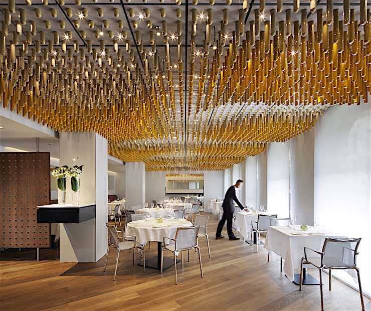 Como the Halkin is the epitome of streamlined and clean minimalism and is well-known for its iconic design. This style and decor extends to the private dining room available in the restaurant of this 5-star hotel. The ceiling of this unique private dining room in Belgravia features a stunning installation of 7,000 glass receptacles filled with spices.