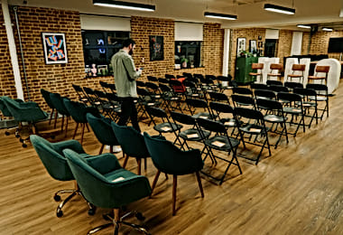 Shoreditch Event Space, Voxonica – This space has been renovated recently where they installed parquet flooring, projection facilities, WiFi, PA, a kitchenette, exposed brick walls and a private courtyard. This space holds 50 standing and up to 30 seated guests.