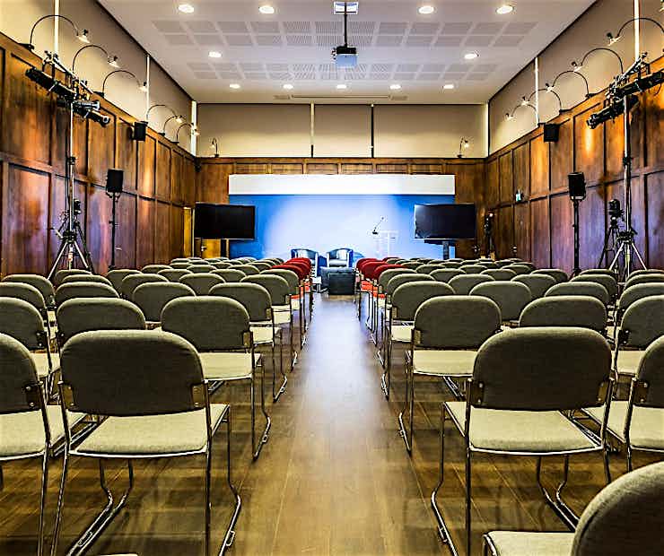 The London Coliseum, located near Trafalgar Square, offers the strikingly deep red Ellis Room within its historic Grade II listed building, ideal for meetings, presentations, and networking by day and drinks and canapés by night. The West End meeting room can accommodate 35 standing, 20 delegates in a boardroom layout, and 16 in a U-shape.