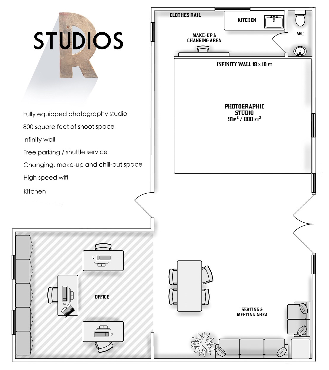 **Hire Rugged Studios for a fantastic studio hire in London** Beautiful, 1,200 square foot, fully equipped photography studio with infinity wall, ceiling mounted Colorama backdrop system, adjoining edit suite. Available for photography and film shoots, gallery space and events.