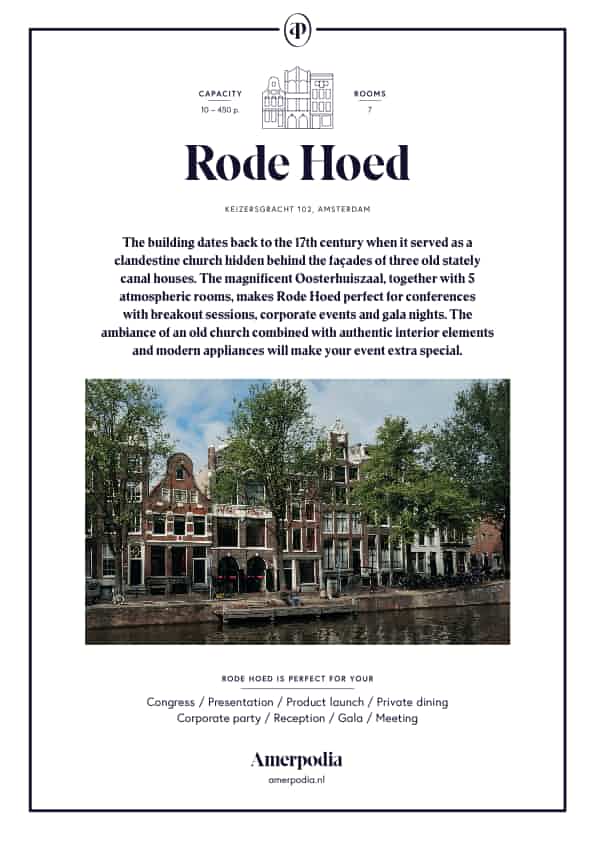 **De Vrijburgzaal in de Rode Hoed in Amsterdam is een kleine vergaderruimte en is ideaal voor presentaties.** De unieke locatie in het hart van Amsterdam aan de historische UNESCO World Heritage grachten maakt van de Rode Hoed een perfecte locatie voor elk type evenement: van bestuursvergaderingen tot prijsuitreikingen. Het gebouw dateert uit de 17e eeuw, toen het diende als een kerk. Tegenwoordig staat de Rode Hoed bekend als een plek voor maatschappelijke debatten, symposia, literaire en muzikale bijeenkomsten, evenals een multifunctionele evenementenlocatie. De prachtige Oosterhuiszaal, samen met 5 andere sfeervolle kamers, maakt de Rode Hoed perfect voor conferenties met breakout-sessies, zakelijke evenementen en gala-avonden. De sfeer van een oude kerk in combinatie met het authentieke interieur en state-of-the-art technische faciliteiten zullen uw evenement extra speciaal maken.