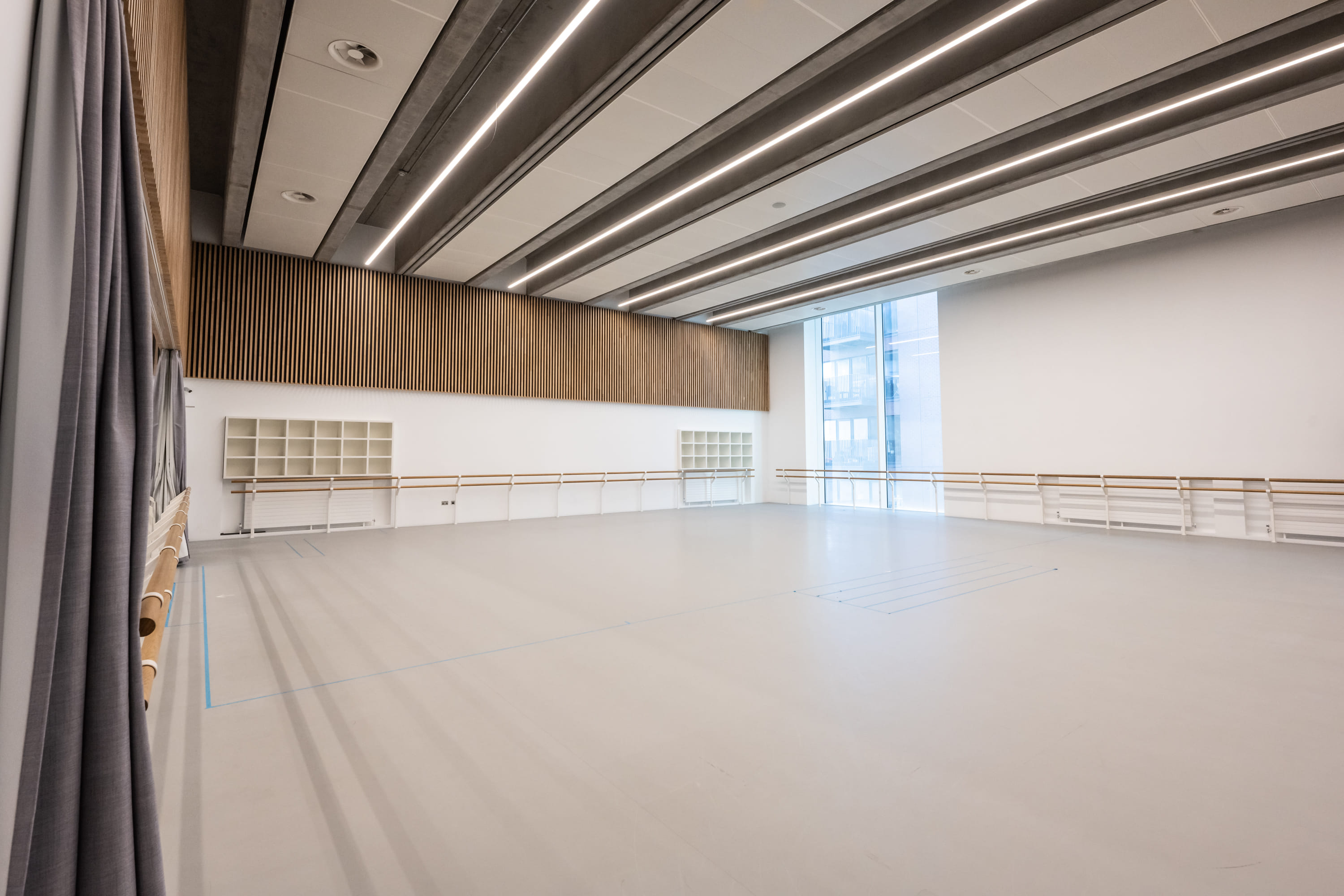 **Book a rehearsal studio at the Mulryan Centre for Dance.** Have exclusive use of our rehearsal studio, 15m x 15m in size, acoustically treated and featuring state of the art harlequin flooring, this world-class rehearsal space is not only the perfect space for any performing arts rehearsal but will also make a fantastic setting for a variety of events. Features dance mirrors and ballet barres on 3-4 walls (which can be covered if requested) speakers, a 55" HD screen, AV system, a piano which can be included in the hire, and lots of natural light from the floor to ceiling windows. English National Ballet has moved into a brand new home on London City Island. The building is easily accessible from the Jubilee Line or the DLR at Canning town and is less than 20 minutes from Central London. The consumption of alcohol is not permitted in the rehearsal studios or any other backstage area. Photos by Michael Molloy ©