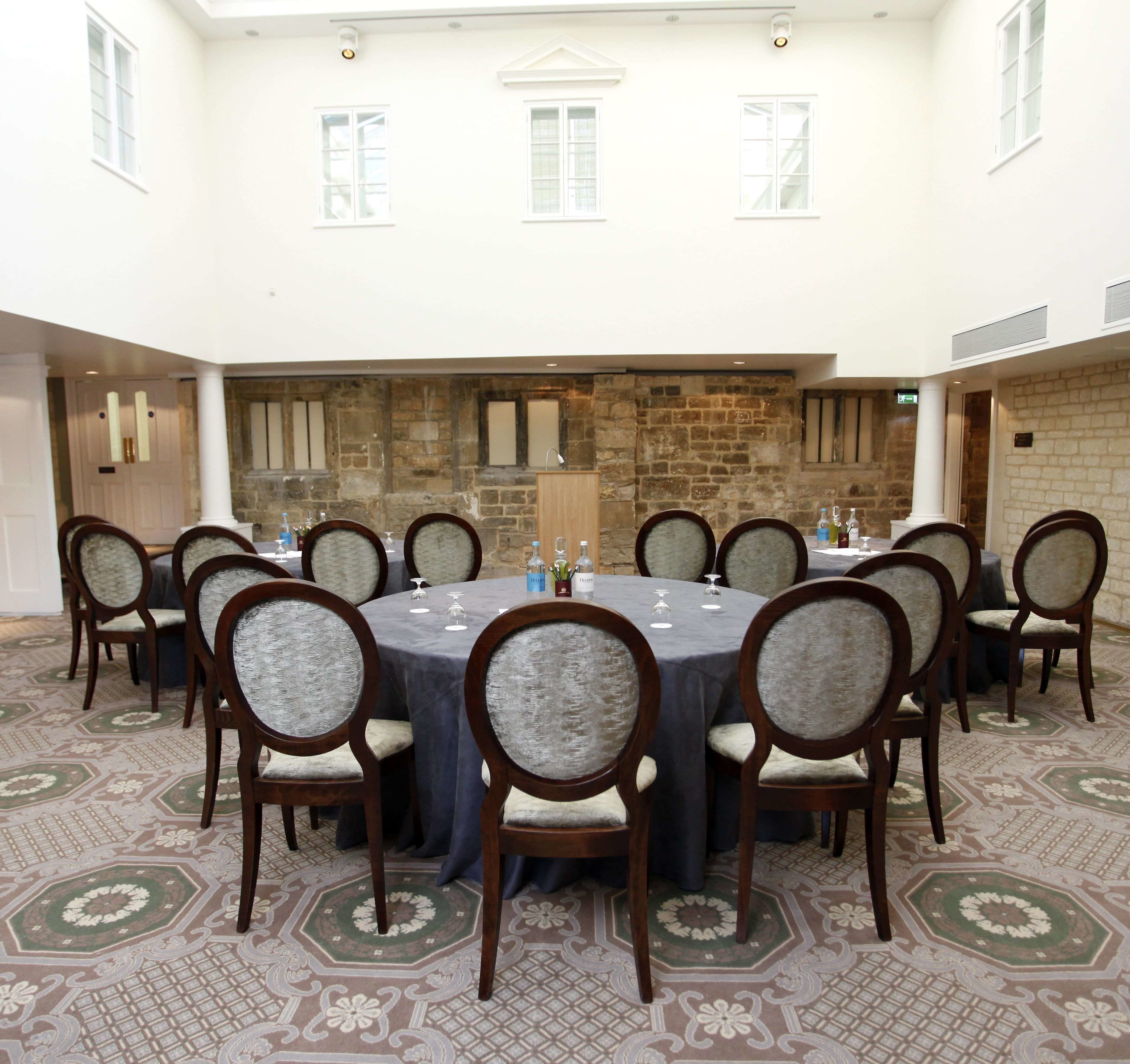 **De La Bere Court is a multi-functional event Space for hire in Cheltenham.** Located on the ground floor of the Main House, this is Ellenborough Park’s largest Space. The vaulted glass atrium means that it is flooded with natural light and there are doors that open out onto the lawn. This room is ideal for any purpose, from larger theatre-style presentations to a standing reception and banqueting.