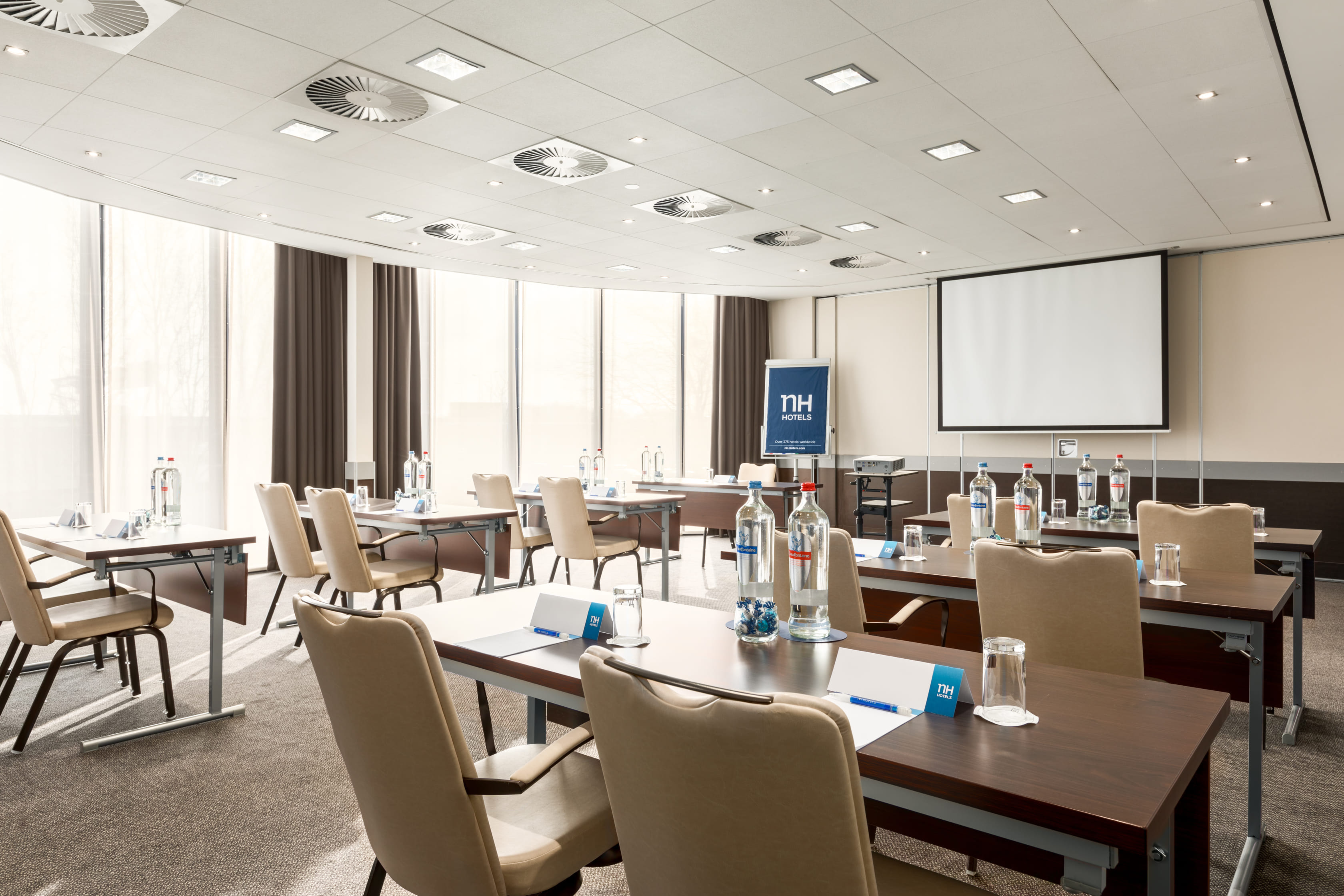 **Room 16 is one of the smaller meeting rooms at NH Amsterdam Schiphol Airport.** This room is ideally suitable for medium-sized business meetings up to 65 persons. The Event Planner stays at your disposal to meet all your needs and wishes regarding food & beverage and audiovisual equipment. The surface area of this Space is 75m2 and the ceiling height is 3.96m. The room is equipped with free Wi-Fi, air conditioning, high-quality furniture, disabled access, lots of natural daylight along with darkening possibility and adjustable lights. **About NH Amsterdam Schiphol Airport:** the hotel is ideal for business meetings and conventions, with 16 multi-functional meeting rooms. The largest Space can hold 700 people. The hotel is closely located to Amsterdam and next to the airport. It's easily accessible by public transport and by car. Besides our meeting facilities, NH also offer 419 modern and comfortable hotel rooms, a fitness area, swimming pool, summer terrace, a restaurant and a bar. **Feel Safe at NH:** NH Hotel Group launched Feel Safe at NH in collaboration with the SGS. As part of this, 10 protocols have been established for the safety of guests, participants and employees. With this, we guarantee that you can organize your meeting or event in a safe and secure environment. The F&B services are also adapted to the current situation. The loaded meeting room capacity is the standard one. In case that any COVID restriction or regulation applies to your request, the selected hotel will apply the corresponding restrictions during the quotation process. Based on destination, size and date of the event.