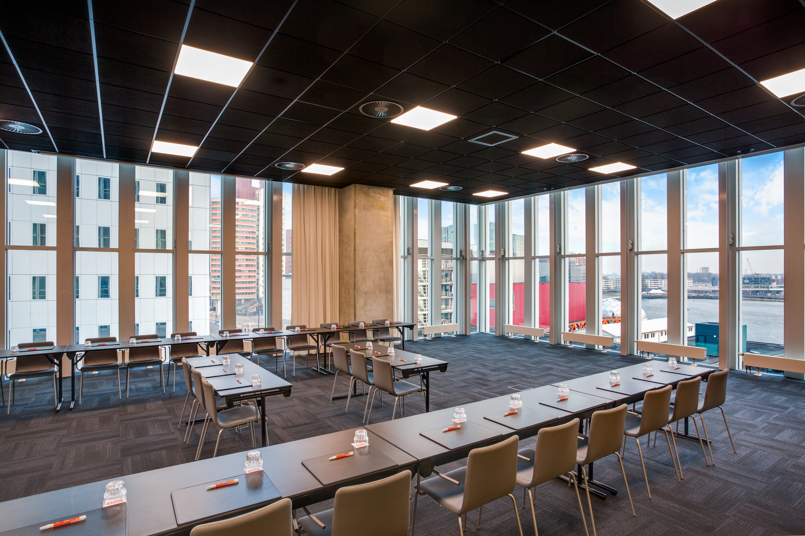 This meeting room is one of the meeting spaces which nhow Rotterdam offers. Meeting Room 5 is very suitable for your meeting, brainstorm session, presentation, a training, network event but also for lots of other goals during your meeting. The surface of this space is 152.7m2 and the ceiling height is 3.40 meters. You can make use of our free Wi-Fi, but we also offer you the possibility to make use of our high speed internet for a small compensation. Furthermore, the room has air conditioning, a carpeted floor, disable access, a fix projector, high quality furniture, high technology audiovisual, is soundproof and has variable light. Besides, you can enjoy a beautiful view which could stimulate your creativity during a brainstorm session. Our dedicated Event Planners are here to assist you in anything and to meet your needs and wishes. Anything is possible. Additionally, we offer facilities for private breakfasts, transport to the city center and airport, hostess service, car and limousine service, translators and photographers. Please make sure that you request these kind of services well in advance. Feel Safe at NH: NH Hotel Group launched Feel Safe at NH in collaboration with the SGS. As part of this, 10 protocols have been established for the safety of guests, participants and employees. With this, we guarantee that you can organize your meeting or event in all health and safety. Our F&B services are also adapted to the current situation. The loaded meeting room capacity is the standard one. In case that any COVID restriction or regulation applies to your request, the selected hotel will apply the corresponding restrictions during the quotation process. Based on destination, size and date of the event.