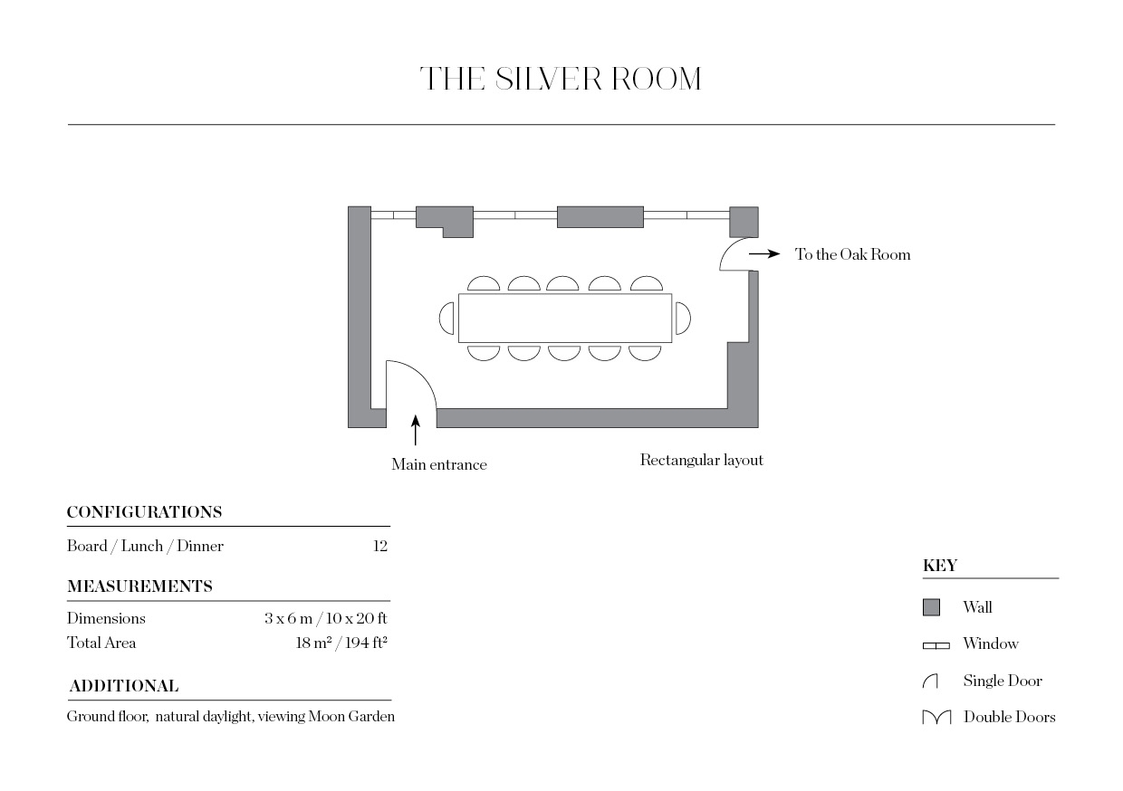 **The Silver Room is a stylish room for hire at The Connaught in Mayfair.** Bright and elegant, the Silver Room is flooded with natural daylight and lined with silvered oak panelling. Featuring authentic artwork and adjustable lighting this room can provide you with your perfect atmosphere and setting. The Silver Room also enjoys a stunning view over the Garden of Illusion, designed by the acclaimed Tom Stuart-Smith.