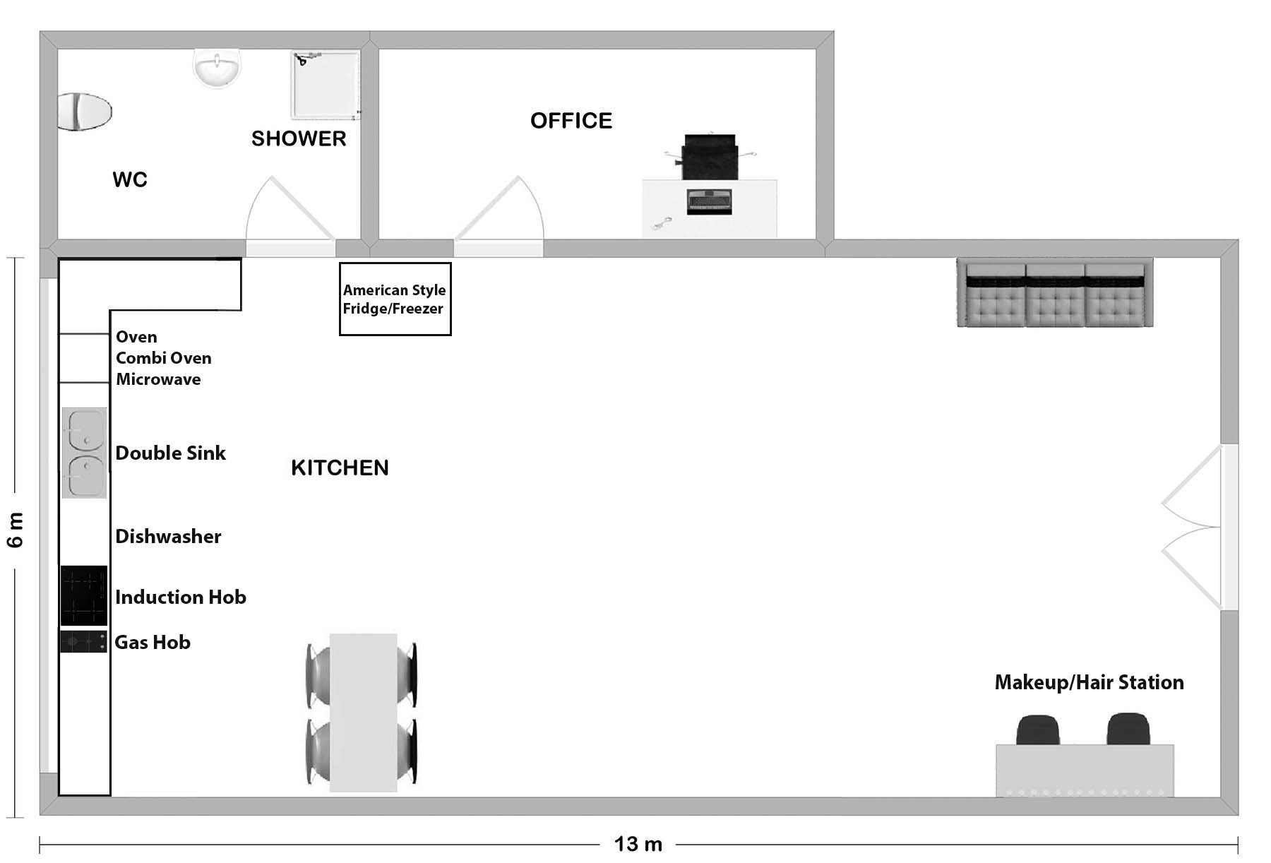 **A beautiful and modern lifestyle kitchen for food photography or popup events.** Fully equipped with double oven combi oven & microwave, induction hob, gas hob, American-style fridge/freezer, dishwasher, double stainless steel sink with mixer tap/handspray, Kenwood kMix food mixer with accessories, Kenwood kMix hand mixer, Kenwood MultiPro food processor, plus kettle, toaster, utensils, cookware, tableware, cutlery, mugs etc.
