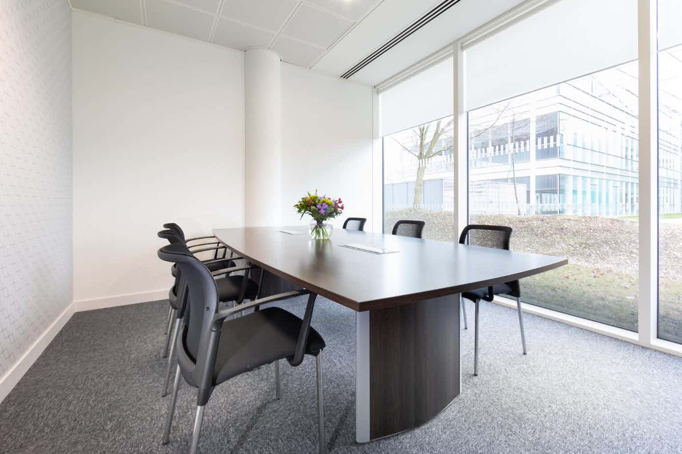 **The Chalfront Room is a spacious, multi-purpose meeting room for hire in Reading.** An internal room with indirect daylight, located on the ground floor with disabled access, AC, Wi-Fi, complimentary still and sparkling water, pads and pencils are provided. The room layout is boardroom style and can be changed to U shape. There is a plasma screen with VGA and HDMI cables. Located on Green Park off M4 corridor, with good transport links to the station, which is a 10 to 15-minute bus/taxi journey. Local amenities include Reading Madjeski Football Stadium and the Oracle shopping centre.