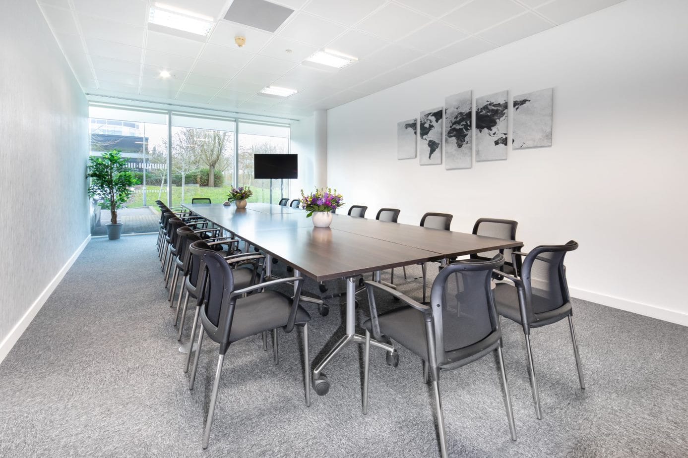 **An external room with natural daylight, located on the ground floor with disabled access, AC, Wi-Fi, complimentary still and sparking water, pads and pencils are provided.** Room layout is boardroom style and can be changed to U-shape, classroom or theatre. There is a plasma screen with VGA and HDMI cables. Located on Green Park off M4 corridor, with good transport links to the station, which is a 10 to 15-minute bus/taxi journey. Local amenities include Reading Madjeski Football Stadium and the Oracle shopping centre.
