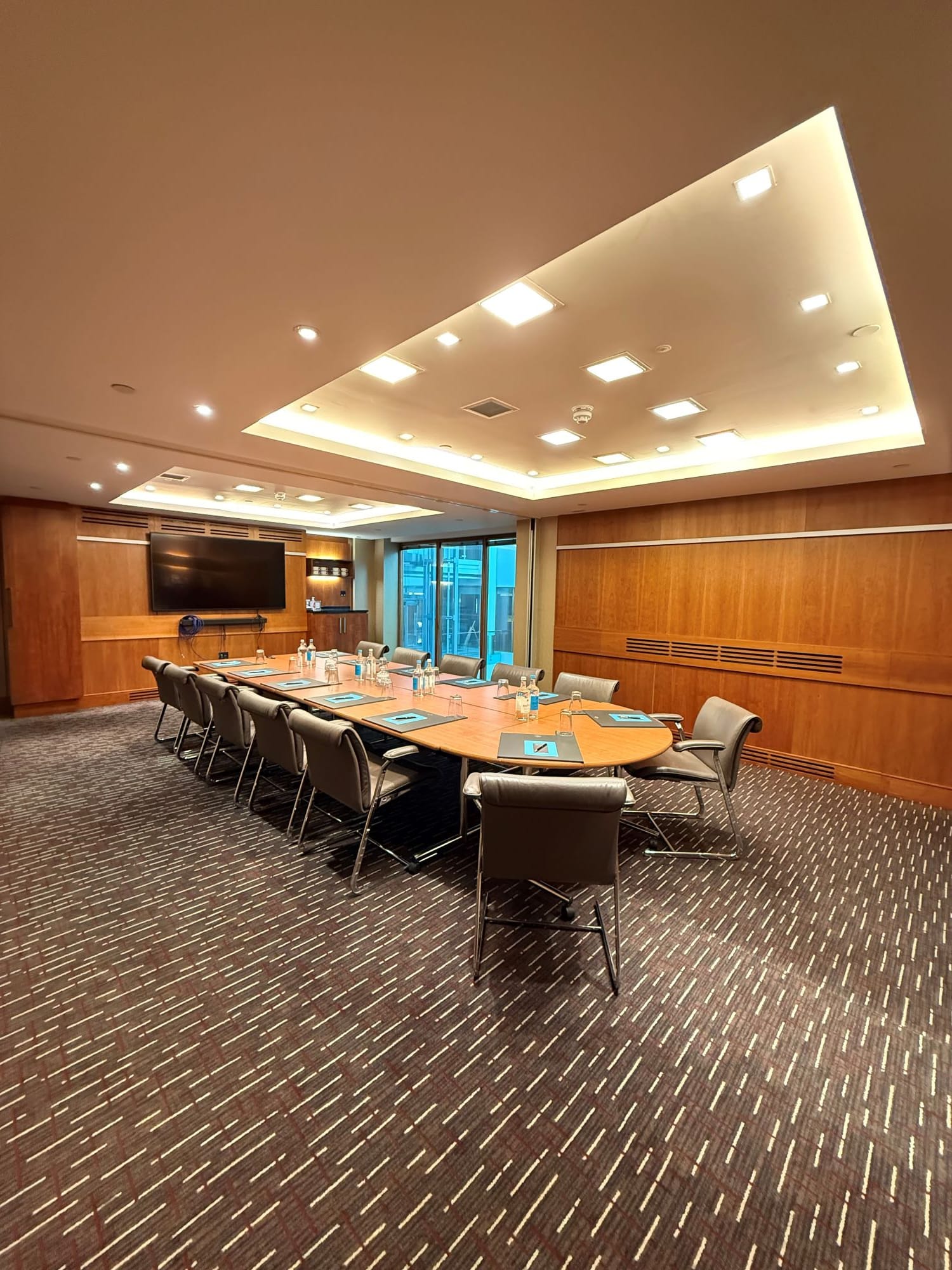 **Sydney is located on the ground level, the room is favoured with natural daylight.** The room has inbuilt AV equipment (chargeable) including a screen, ceiling-mounted projector and touch screen remote control. On-site AV partner can assist with any other requirements. High-Speed Internet Access is available. The meeting room is equipped with in-room tea/coffee station and boasts Hugo Boss chairs.
