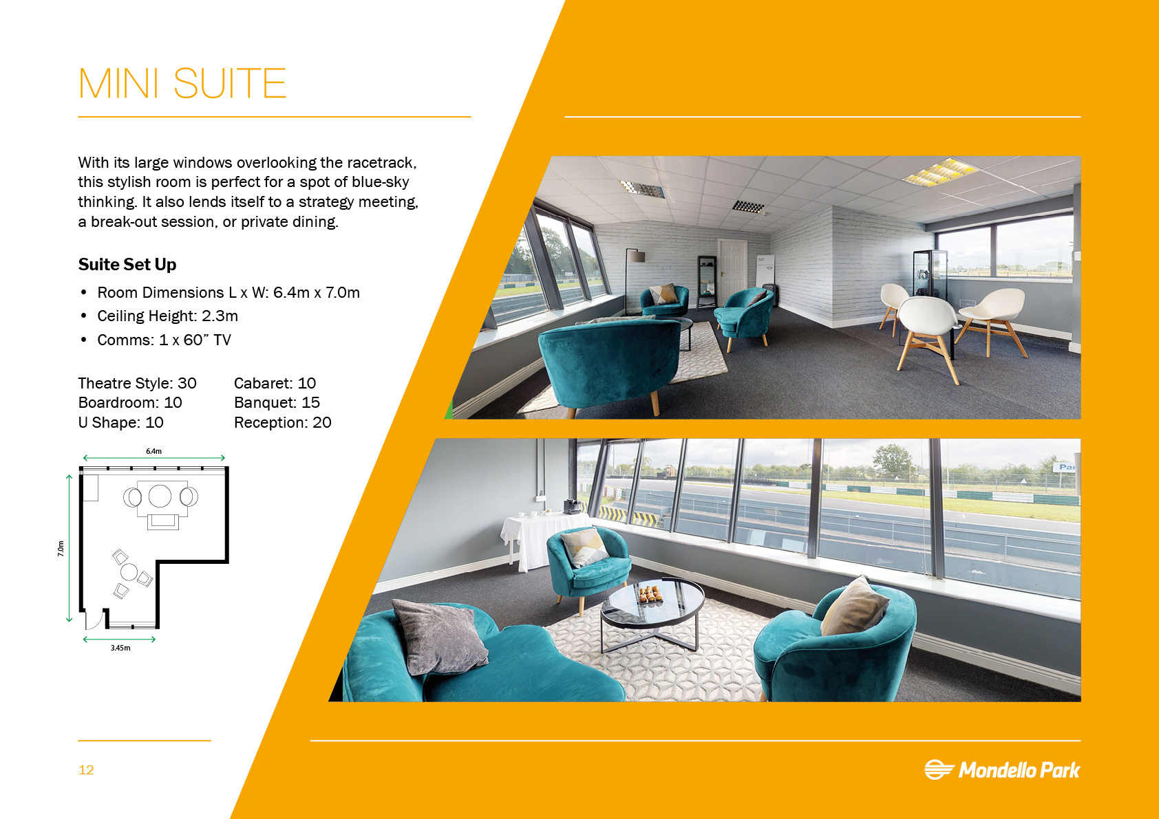 **The Mini Suite at Mondello Park is an intimate meeting room for hire in Kildare.** With its large windows over looking the racetrack, this stylish room is perfect for a spot of blue-sky thinking. It also lends itself to a strategy meeting, a break out session, or private dining.