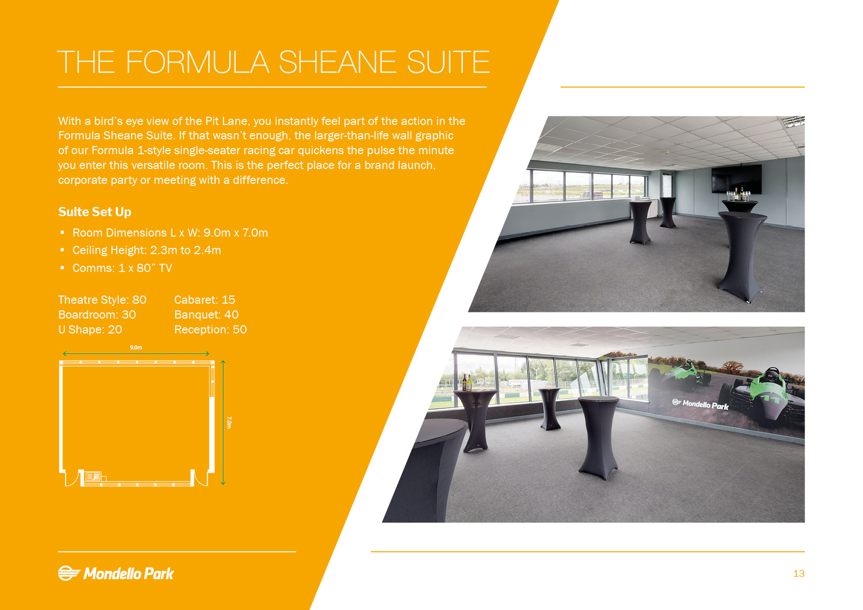 **With a bird's eye view of the pit lane, you instantly feel part of the action in The Formula Sheane Suite.** If that wasn't enough the larger-than-life wall graphic of the formula 1style single seating racing car quickens the pulse the moment you enter this versatile room. This is the perfect place for a brand launch, corporate party, or meeting with a difference.