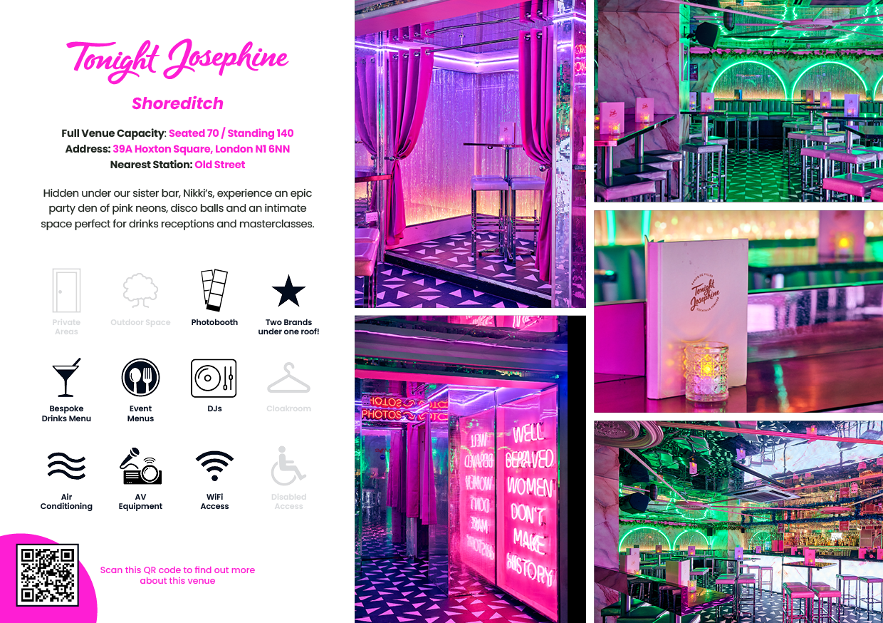Josephine is bringing a new hangout to Shoreditch! Join Josephine's gang for cocktails in Shoreditch. The sister venue in Waterloo is one of the most Instagrammed venues in the UK. Join us for BIG late night parties, insane themed bottomless brunch events and unrivalled vibes in the heart of East London's nightlife scene. Available for full private hire, including daytimes and Sundays.
