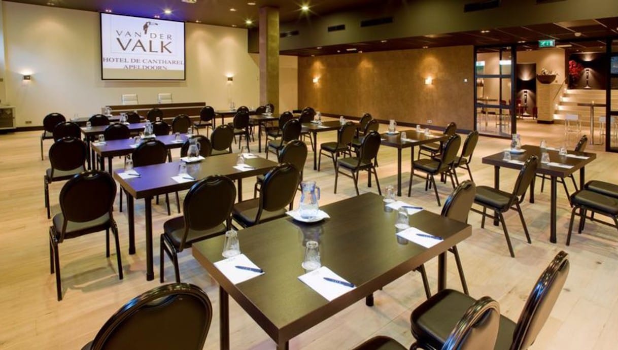 Van der Valk Hotel Apeldoorn - de Cantharel is situated in green surroundings, near Apeldoorn’s city centre. The luxurious rooms and the wellness centre offer a relaxing setting. Hotel de Cantharel combines luxury hotel facilities, fabulous surroundings and charming small-scale expertise in a single, unique hotel farmstead. For instance, on the land that surrounds it, the Cantharel offers its guests a country house, a horse hotel, barrel-top wagon tours through the area, stylish dinners in outdoor tents, culinary surprises in restaurant Huisje James with it’s own vegetable garden. De Lage Veluwe (252m2) is a stylish and trendy conference space that is perfect for groups up to 120, or as a side room to the Auditorium. Max. setup 1.5 metres distance: Boardroom: - Classroom: 27 seats Theater style: 35 seats U-shaped: 18 seats Cabaret: 28 seats Dinner/rounds: -