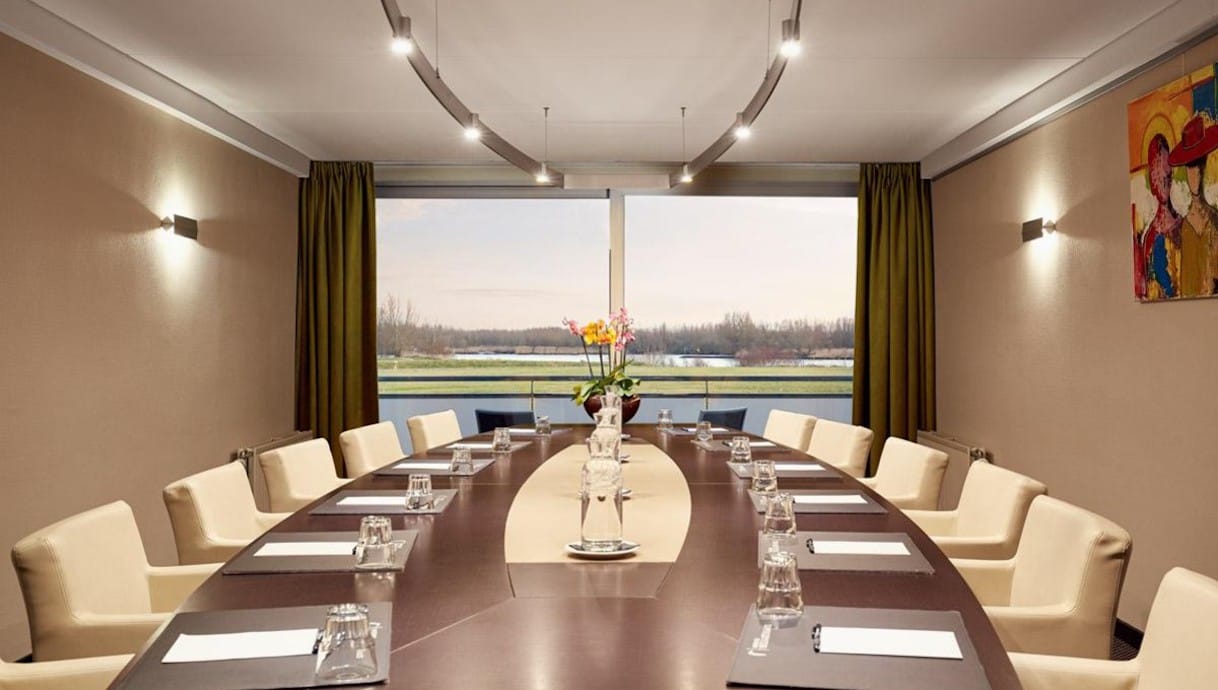 These boardrooms are located on the ground floor of the hotel. The rooms have a glass wall on the outside, resulting in an ample supply of natural light and a beautiful river view. Both the rooms have a spacious balcony. This room is suitable for your smaller meetings up to 16 people, or as a breakout room during a bigger event. The room is equipped with a large oval table and luxurious armchairs, and a LED-screen..