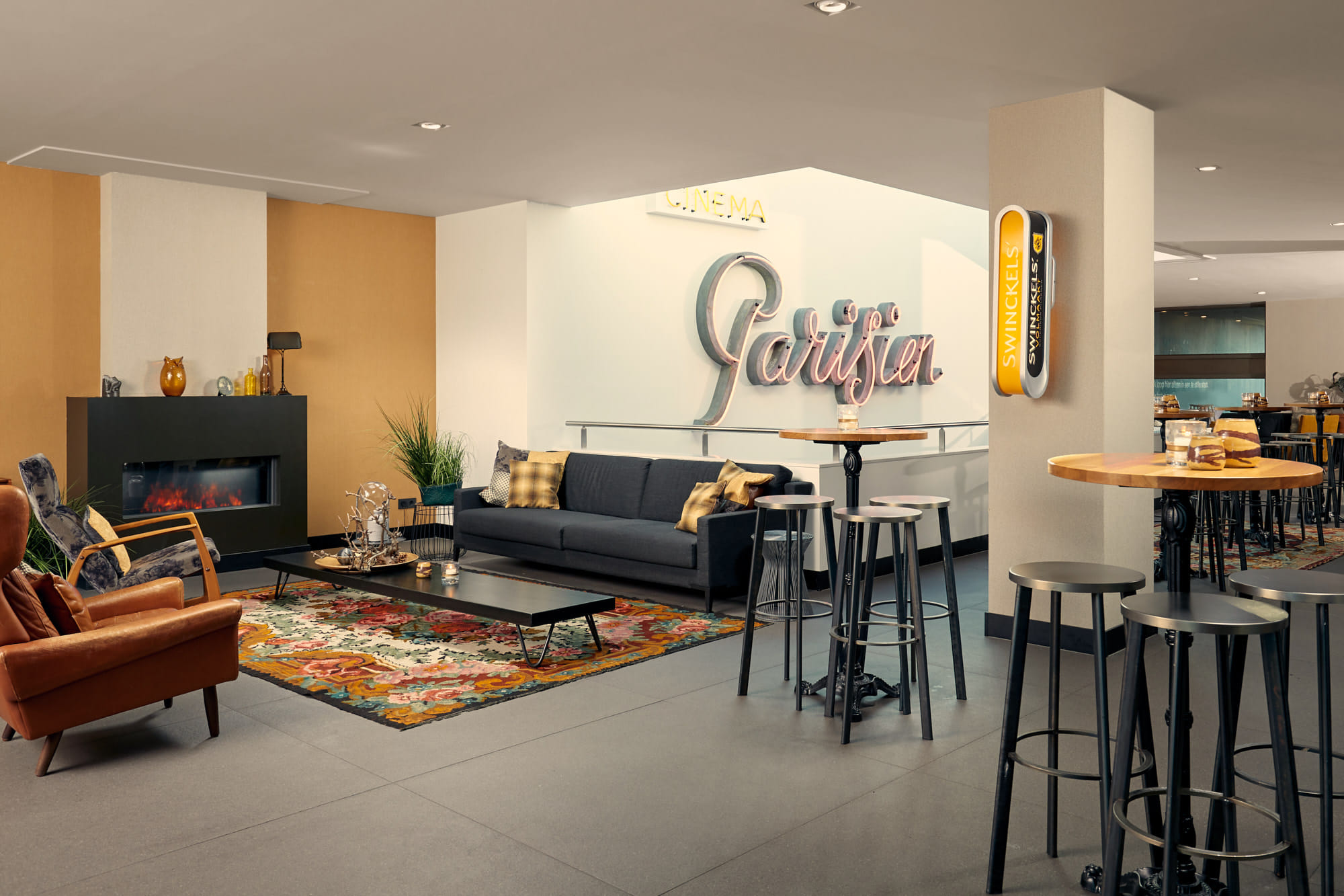 040 Congress & Events has its own café; Café Cinema Parisien. Here you and your guests can conclude a successful congress or event in a cozy environment while enjoying a drink and a bite to eat. The space owes its name to the former Eindhoven cinema from 1917, which was located on the Vrijstraat in Eindhoven. The original logo has been renovated and now adorns the wall of the café in the 040 Congress & Events center in Eindhoven. Cinema Parisien is decorated in 50/60 style with references to Eindhoven. These references to the city of Eindhoven and its history can be found throughout Hotel Eindhoven. Curious about the possibilities? Feel free to contact our reservations department. We are happy to help you!