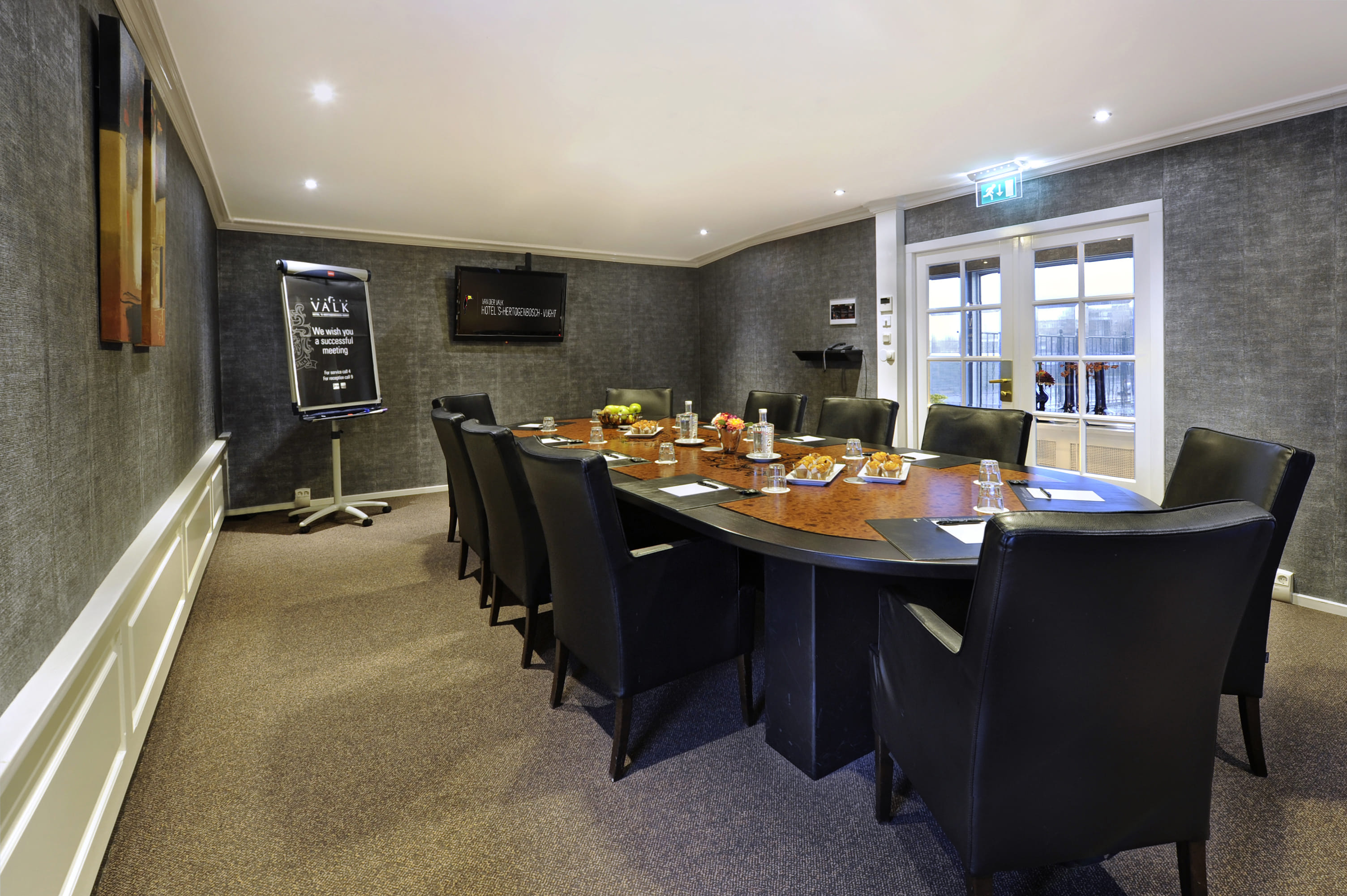 You can choose from no less than 15 stylishly-fitted rooms in the hotel; ranging from a boardroom for 2 persons to a multifunctional room for 300 persons. All rooms are fitted with comfortable tables and chairs, daylight and air conditioning. Whether it’s a meeting, congress, party night, dinner or wedding, we’re happy to organise it for you. The Beethoven room is a modern room with a block set-up suitable for groups of up to 10 persons. You can connect your laptop to the LCD screen in the room. The room has, among other things, daylight, air conditioning and WIFI, its own coffeemaker and a fridge filled with mineral water and soft drinks.