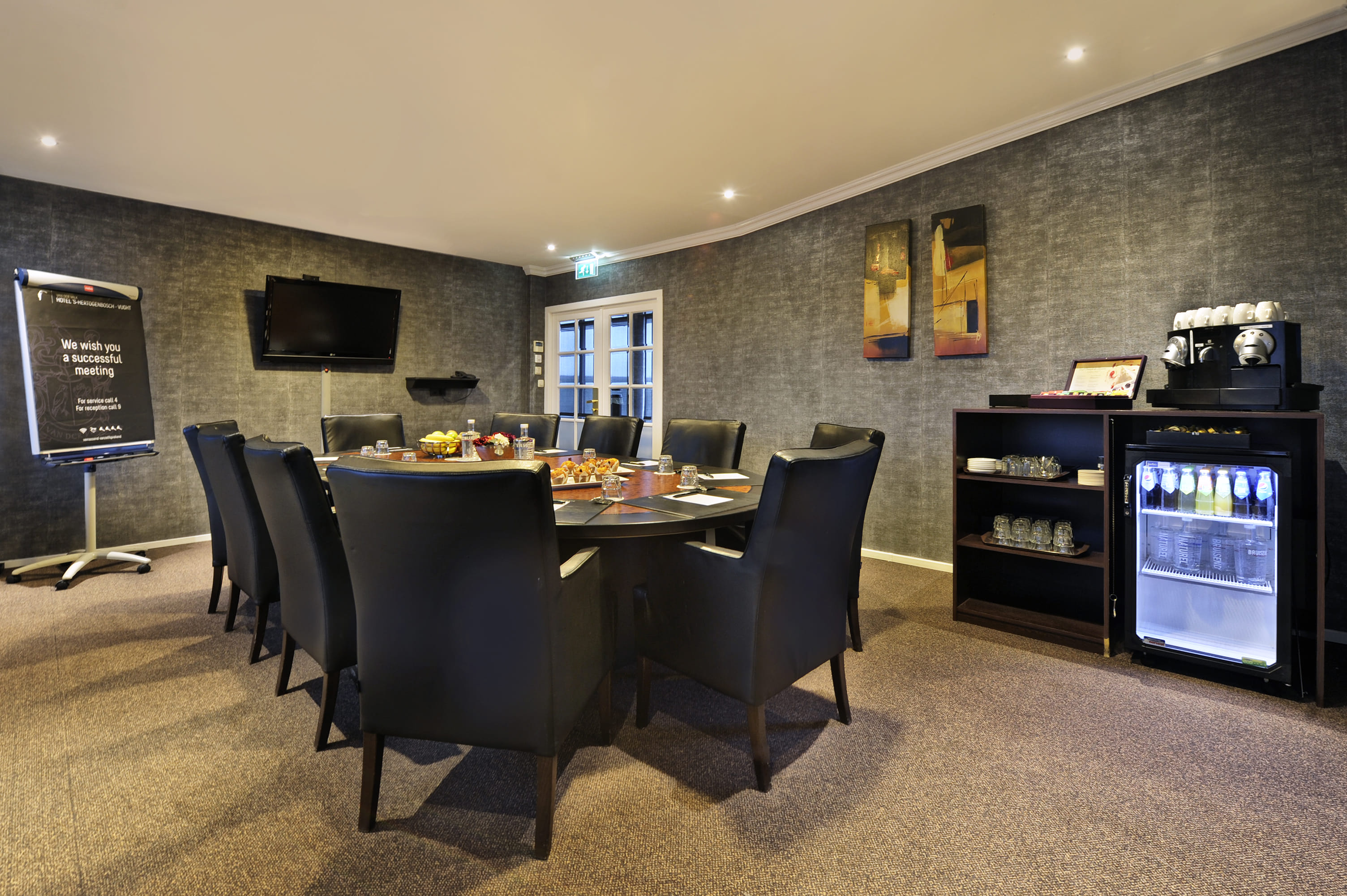 You can choose from no less than 15 stylishly-fitted rooms in the hotel; ranging from a boardroom for 2 persons to a multifunctional room for 300 persons. All rooms are fitted with comfortable tables and chairs, daylight and air conditioning. Whether it’s a meeting, congress, party night, dinner or wedding, we’re happy to organise it for you. The Chopin room is a modern room with a block set-up suitable for groups of up to 10 persons. You can connect your laptop to the LCD screen in the room. The room has, among other things, daylight, air conditioning and WIFI, its own coffeemaker and a fridge filled with mineral water and soft drinks.
