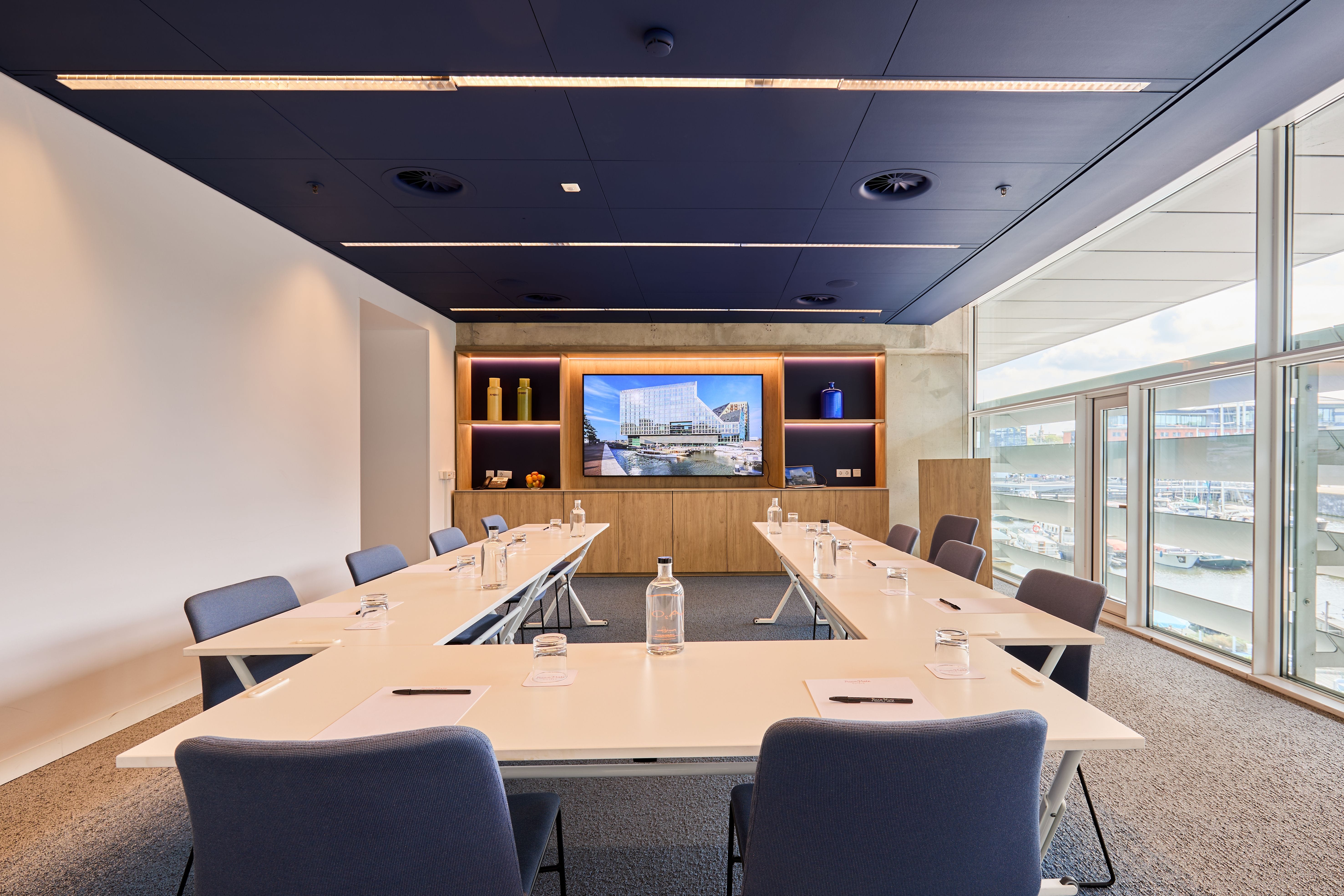 Do you want to experience staying a strikingly designed all-glass hotel in Amsterdam? Room Mate Aitana is located in the heart of Amsterdam, in a modern building on the new artificial island in the IJ River, next to the new Courthouse, Central Station and really close to Dam’s Square, the city’s historic centre, and near the main tourist attractions and the capital’s business centres. Enjoy a cool beer in the bar, exercise in the gym or go for a walk along the private pier to check out the canals. If you have any questions, visit our personalised service desk where we will be more than happy to provide you with best city recommendations! What else can we do for you? Take a second to watch the views! This is the perfect room for flexible meetings: for an intimate and more relaxed ambient, choose the Emma Room; and if you need more space, don’t worry, we have it figured out. You can link it with the next door meeting room and make your event even bigger!