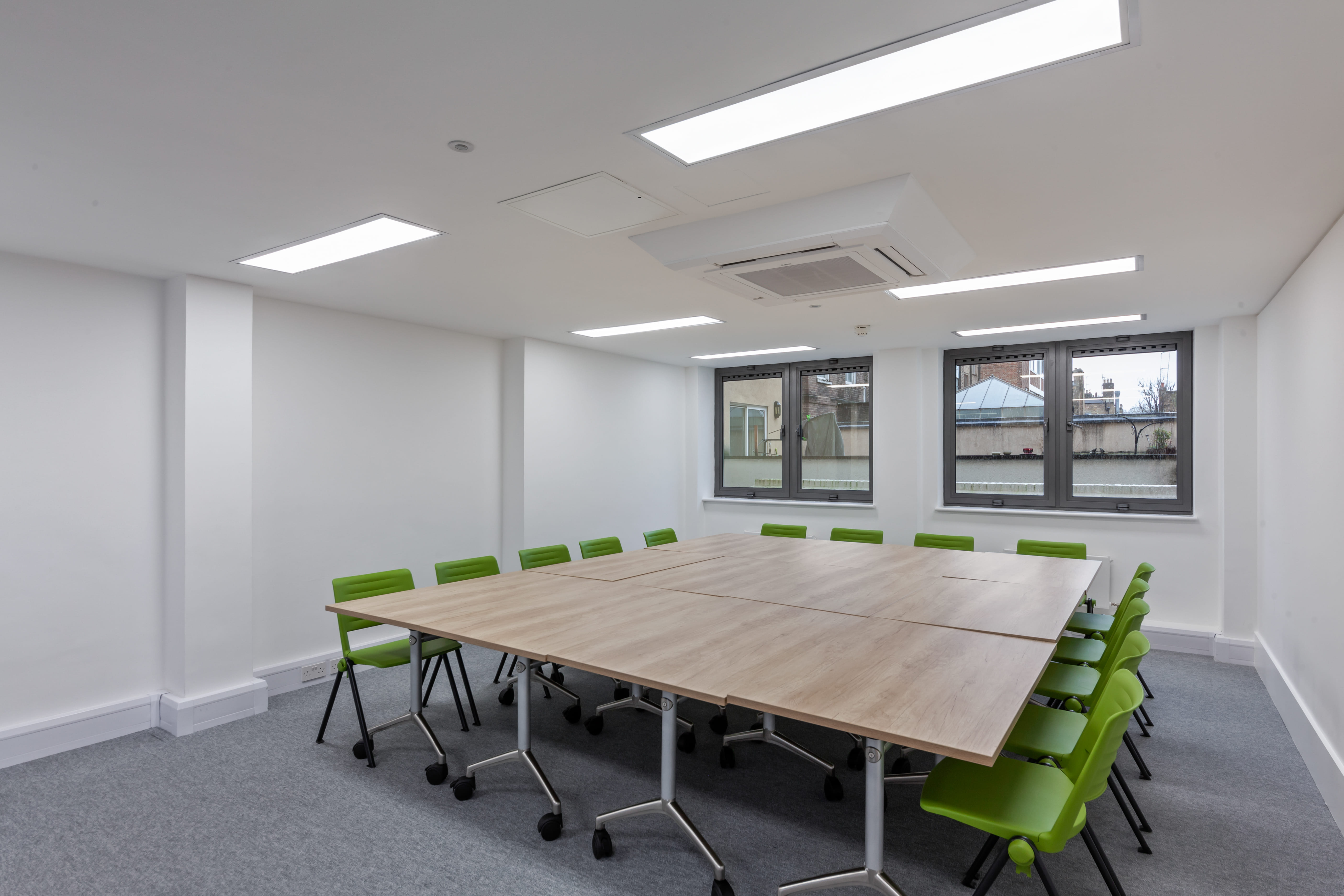 **A vibrant classroom on the first floor with a capacity for 24.** The room is equipped with: - Modern AV - Interactive display screen (with touch solutions for Zoom calls) - Interactive whiteboard - Video and content sharing at room scale for Zoom calls and other video communication technology options - Wi-Fi access - AC - Disabled access In line with COVID 19 this room can accommodate: - 2m Distancing 8 Delegates - 1m Distancing 14 Delegates There are also: * Temperature checks in place with InterScan system * QR code check-in *Hand Sanitizing stations on each floor * Webcam use (additional costs may occur) * Covid secure catering (additional costs may occur)