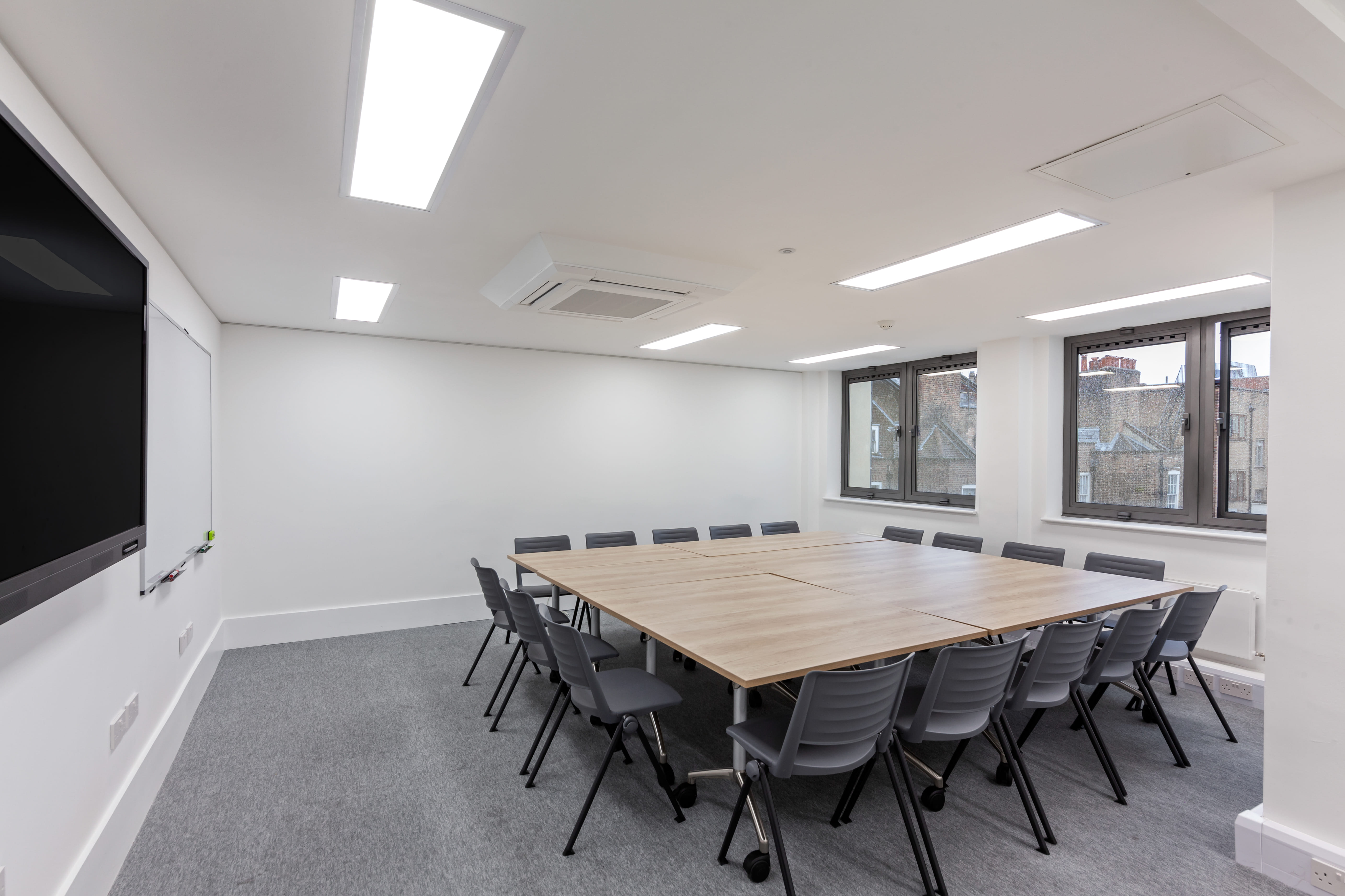 **A vibrant room with a capacity for 24.** The room is equipped with: - Modern AV - Interactive display screen (with touch solutions for Zoom calls) - Interactive whiteboard - Video and content sharing at room scale for Zoom calls and other video communication technology options - Wi-Fi access - AC - Disabled access In line with COVID 19 this room can accommodate: - 2m Distancing 8 Delegates - 1m Distancing 14 Delegates There are also: * Temperature checks in place with InterScan system * QR code check-in *Hand Sanitizing stations on each floor * Webcam use (additional costs may occur) * Covid secure catering (additional costs may occur)
