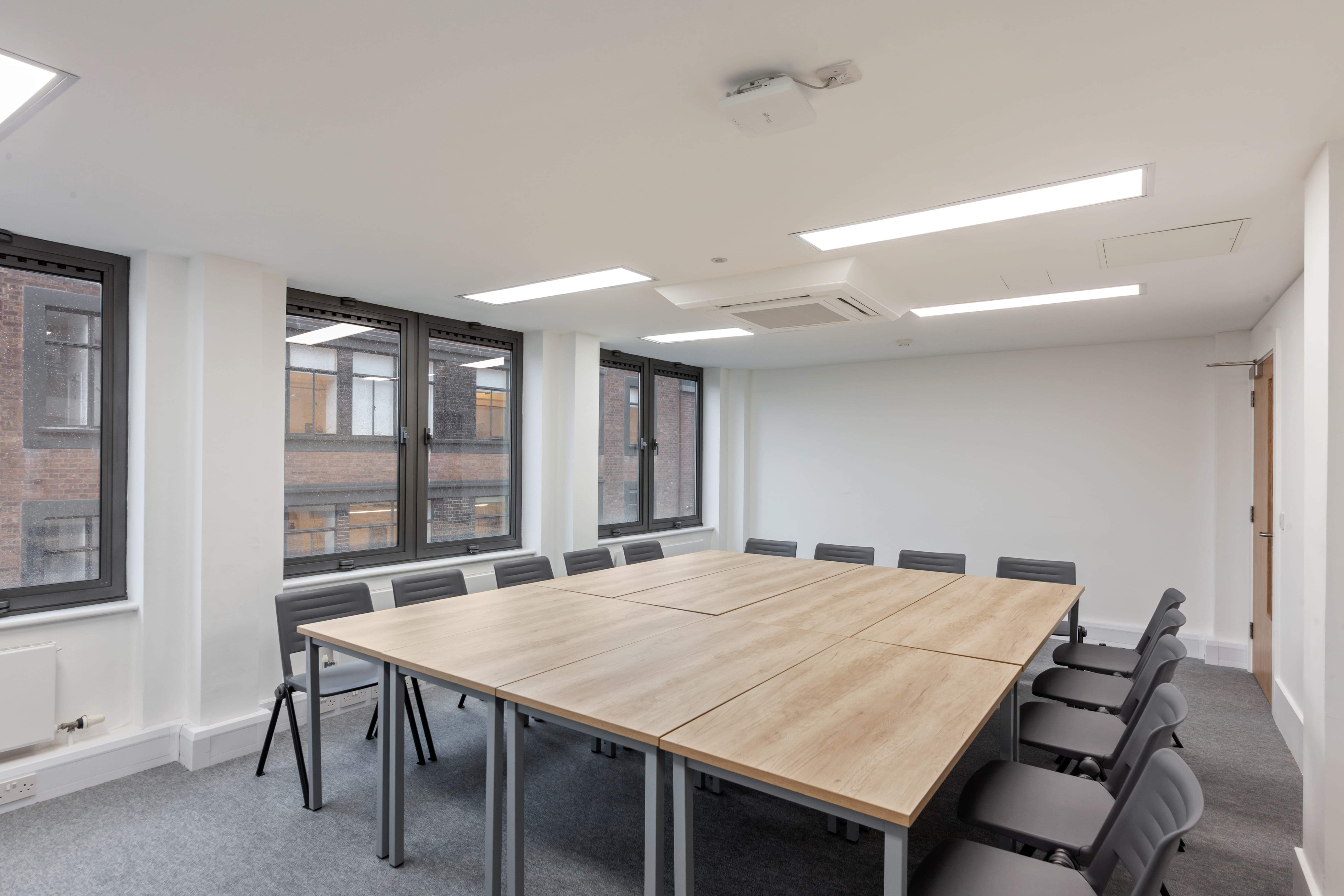 **Forster Room is a vibrant classroom located on the third floor with a capacity for 20 delegates.** The room is equipped with: - Modern AV - Interactive display screen (with touch solutions for Zoom calls) - Interactive whiteboard - Video and content sharing at room scale for Zoom calls and other video communication technology options - Wi-Fi access - AC - Disabled access In line with COVID 19 this room can accommodate: - 2m Distancing 8 Delegates - 1m Distancing 14 Delegates There are also: * Temperature checks in place with InterScan system * QR code check-in *Hand Sanitizing stations on each floor * Webcam use (additional costs may occur) * Covid secure catering (additional costs may occur)
