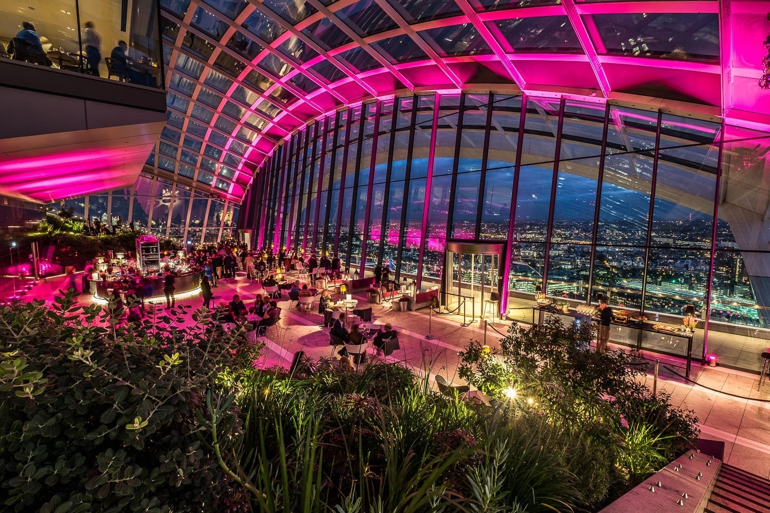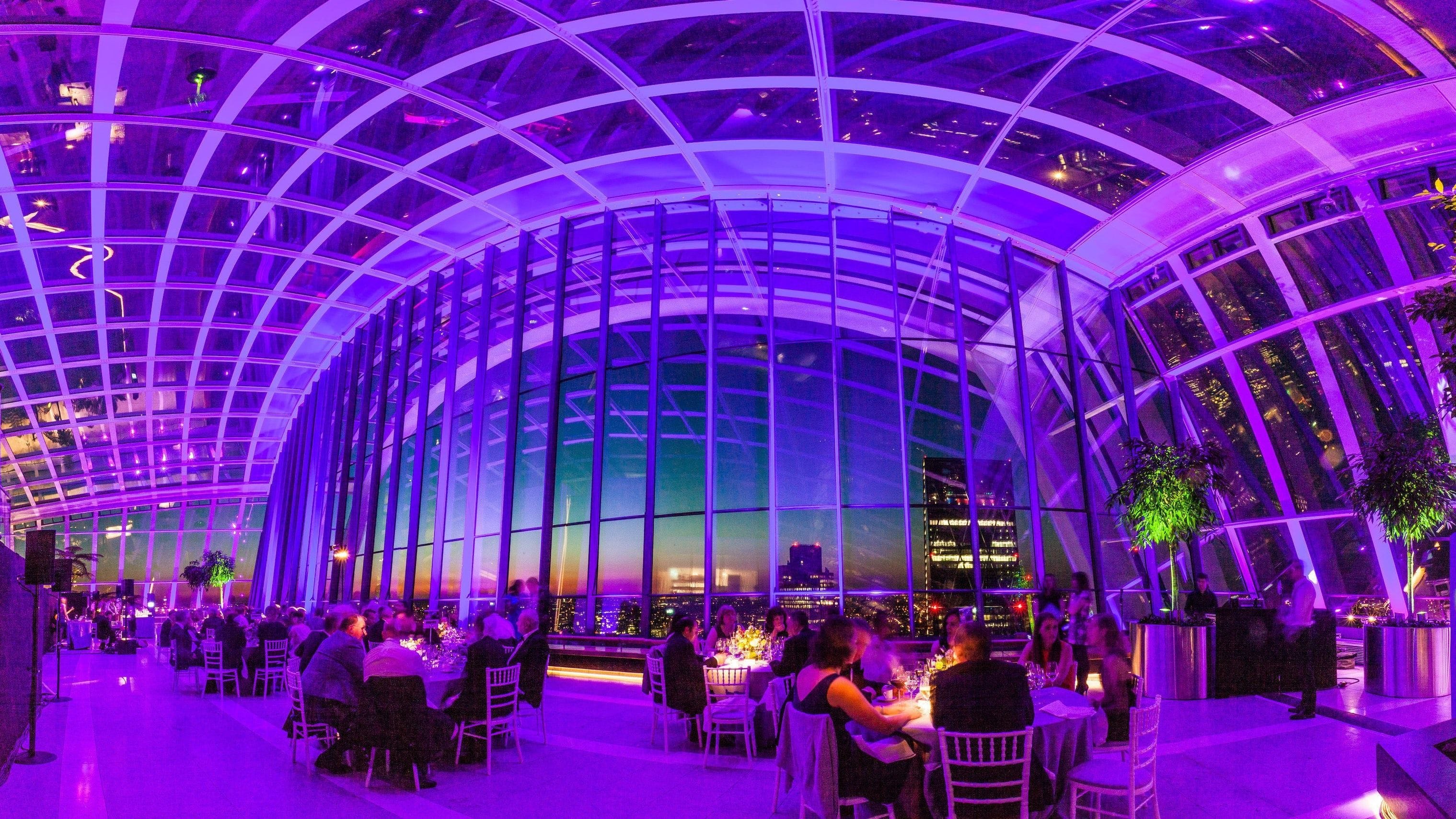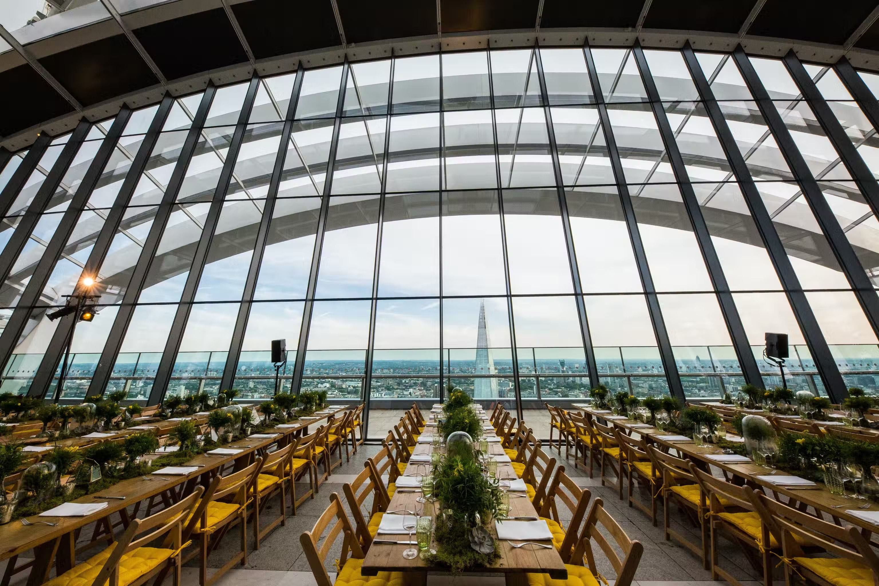**Sky Garden is a stunning unique London venue for hire for special events where you can host a spectacular private dinner or party in an iconic venue.** Sky Garden is an exceptional and unique venue with 360-degree panoramic views of London. The Space has an unrivalled outlook over the River Thames from level 35 and stunning vistas overlooking St Paul’s and City of London from level 36. This truly magnificent Space is the perfect venue for special celebrations, private dining and private parties. This is one of the best private dining rooms London has to offer with beautiful designs and greenery to make the Space standout, any dining experience here will have a touch of class. The Sky Garden has capacity for 300 guests for a dinner and up to 700 guests for a reception. There is a variety of food on offer for every occasion. Exclusive hire is available for full-day from 6am to 6am or half day from 4pm and 2am. 155 metres up, the spectacular Sky Garden offers views across the capital and far beyond the Sky Garden can be found right in the heart of the City just a short distance from London Fenchurch Street.