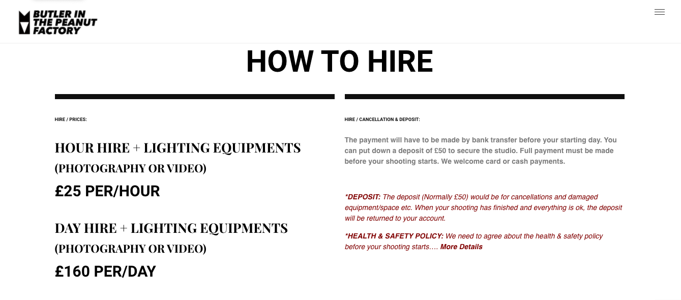 "BUTLER IN THE PEANUT FACTORY" IS A MULTIPLE PHOTOGRAPHIC STUDIO IN THE OLD PEANUT FACTORY IN HACKNEY WICK / FISH ISLAND, LONDON E3. IT’S A COZY / INDUSTRIAL DESIGNED SHOOTING STUDIO FOR ART, FASHION, RETAIL, PORTRAITS, PRODUCTS & CASTING FOR FASHION. ALSO A PLACE TO HIRE FOR TESTING EXPERIMENTAL MEDIA / ART INSTALLATIONS. HOUR HIRE + LIGHTING EQUIPMENTS (PHOTOGRAPHY OR VIDEO) £25 PER/HOUR DAY HIRE + LIGHTING EQUIPMENTS (PHOTOGRAPHY OR VIDEO) £160 PER/DAY
