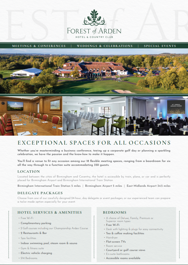 The Woodland Suite is a highly flexible, ground-floor venue designed for large-scale events at the Forest of Arden Hotel & Country Club. This magnificent space is designed for ultimate versatility: it can be used as one large room for major events or easily divided into three separate sections to suit varying needs. For added convenience, the suite features a welcoming foyer area and an exclusive private bar, making it a perfect choice for hosting large-scale business conferences, banquets, and social parties.