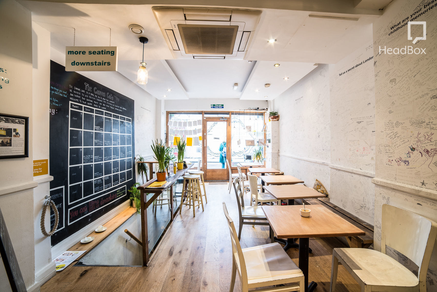**The Basement at Canvas Cafe in Shoreditch, London, just off Brick Lane is a creative London cafe venue for hire for any kind of event.** It’s all in the name - the walls are a blank canvas for your thoughts, ideas, secrets and stories, making it an ideal creative meeting space with an inspiring atmosphere. If you are searching for a unique London venue that is friendly, happy and welcoming, with a strong sense of community, you may have just found it. With a focus on community, this is an ideal venue for charities and local organisations looking for a space to explore ideas. This venue is a social enterprise, not-for-profit, and committed to improving self-esteem and confidence in the community - all events are designed to make people feel happier. Working alongside their partner charity, Body Gossip, at this London cafe you can express yourself, be inspired by others and become part of an ever-evolving piece of live art. The flexible basement space at the London Canvas Cafe can be used to host creative workshops, as well as theatre shows, live music, film screenings and cabaret. The venue is licensed until 1am, and also able to provide a variety of catering options, from coffee, homemade breakfast and lunch platters to sit-down meals and canapes. There is capacity for 40-50 people standing, 35-40 seating, 20-30 desk/cabaret seating and 10-12 for a fitness class. A high-spec projector and large screen are available, as well as a microphone and stand, basic LED stage lights and a basic sound system.