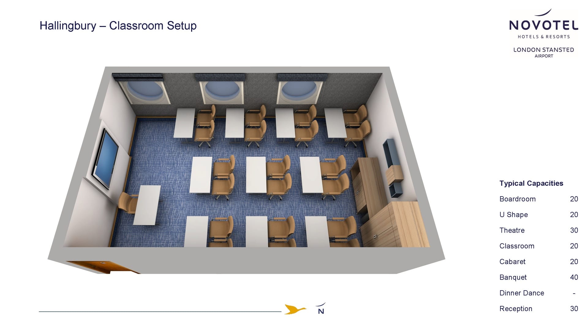 Hire Cost £0 Exc Features Air Conditioning | Blackout | Flipchart | Internet Connection | LCD Projector | Lighting – Low Voltage | Natural Daylight | Overhead Projector | Screen | Three Phase Power | Wi-Fi Connection Access Floor Level L1 | Has Disabled Access Dimensions W 5.1m L 7.8m H 2.3m Area 39.8m2 The room is situated on the 1st floor of the hotel and can accommodate 2-30 people. There are skylights for natural daylight and air conditioning.