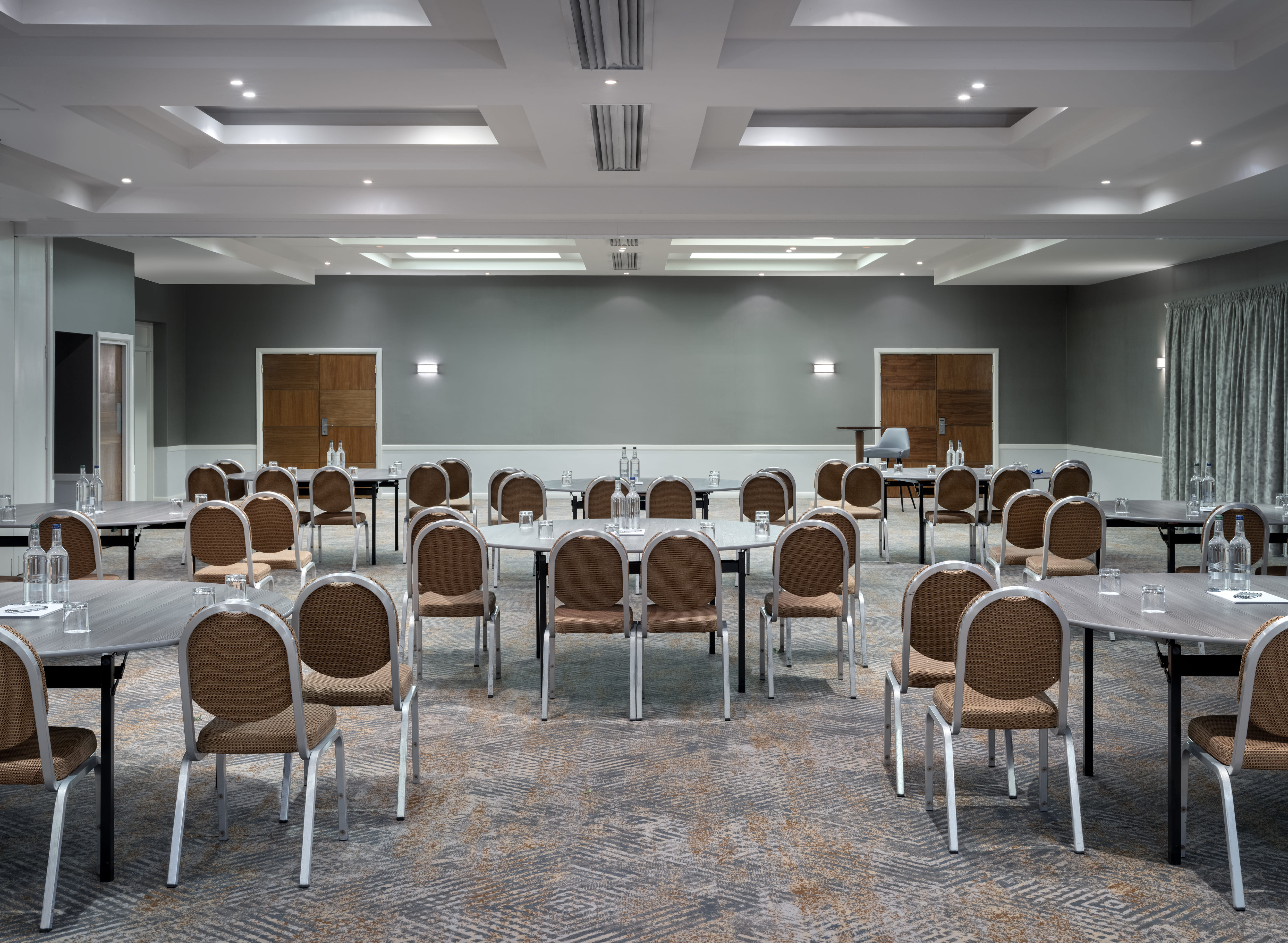 One section of the Sir Henry Royce Suite. 6x12x3 m - 72 sq m. An innovative event space with built in stage, to deliver productive meetings. With natural daylight overlooking the lake and facilitated for your comfort by the Marriott Meeting Services App. Lunch and breaks can be served in the room, conference foyer or restaurant. The room is equipped with modern amenities to ensure a seamless event experience, including air conditioning, accessibility features, and a projector screen.