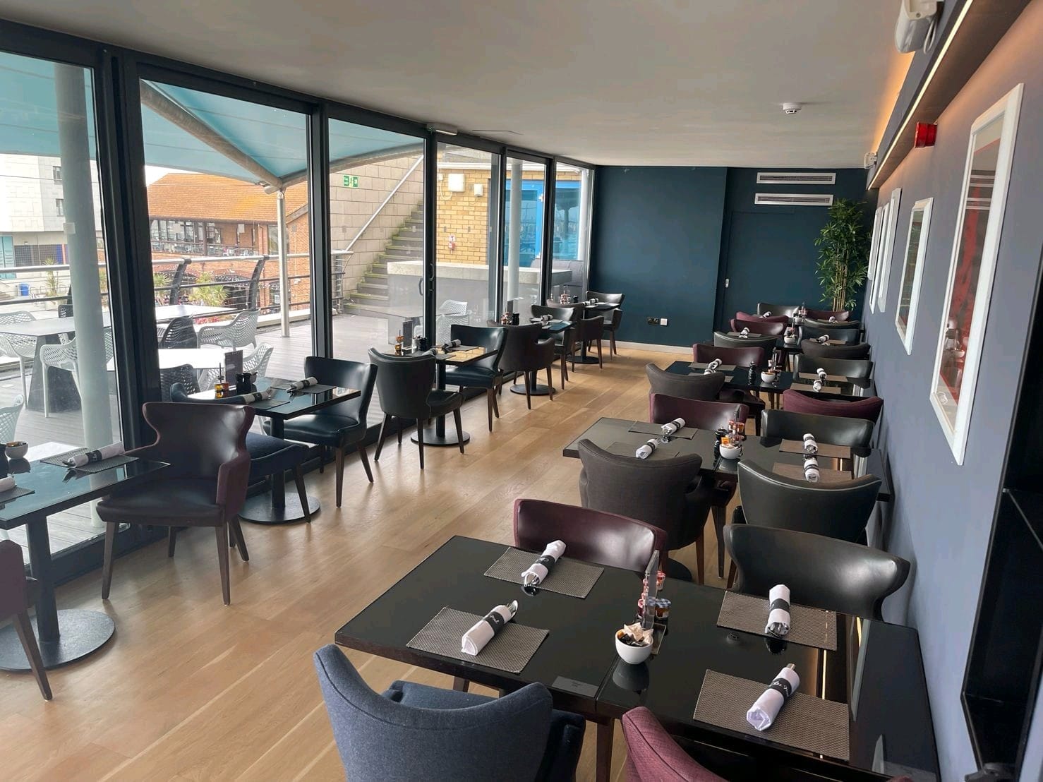 The Conservatory at Malmaison Brighton offers a beautifully light-filled and contemporary setting for private dinners, perfectly positioned to overlook the vibrant marina. With its sleek glass frontage and direct access to the outdoor terrace, this space blends modern elegance with coastal charm, creating an inviting atmosphere for both daytime and evening gatherings. The Conservatory comfortably accommodates up to 50 guests for seating dining and up to 80 for standing receptions or BBQ style events.