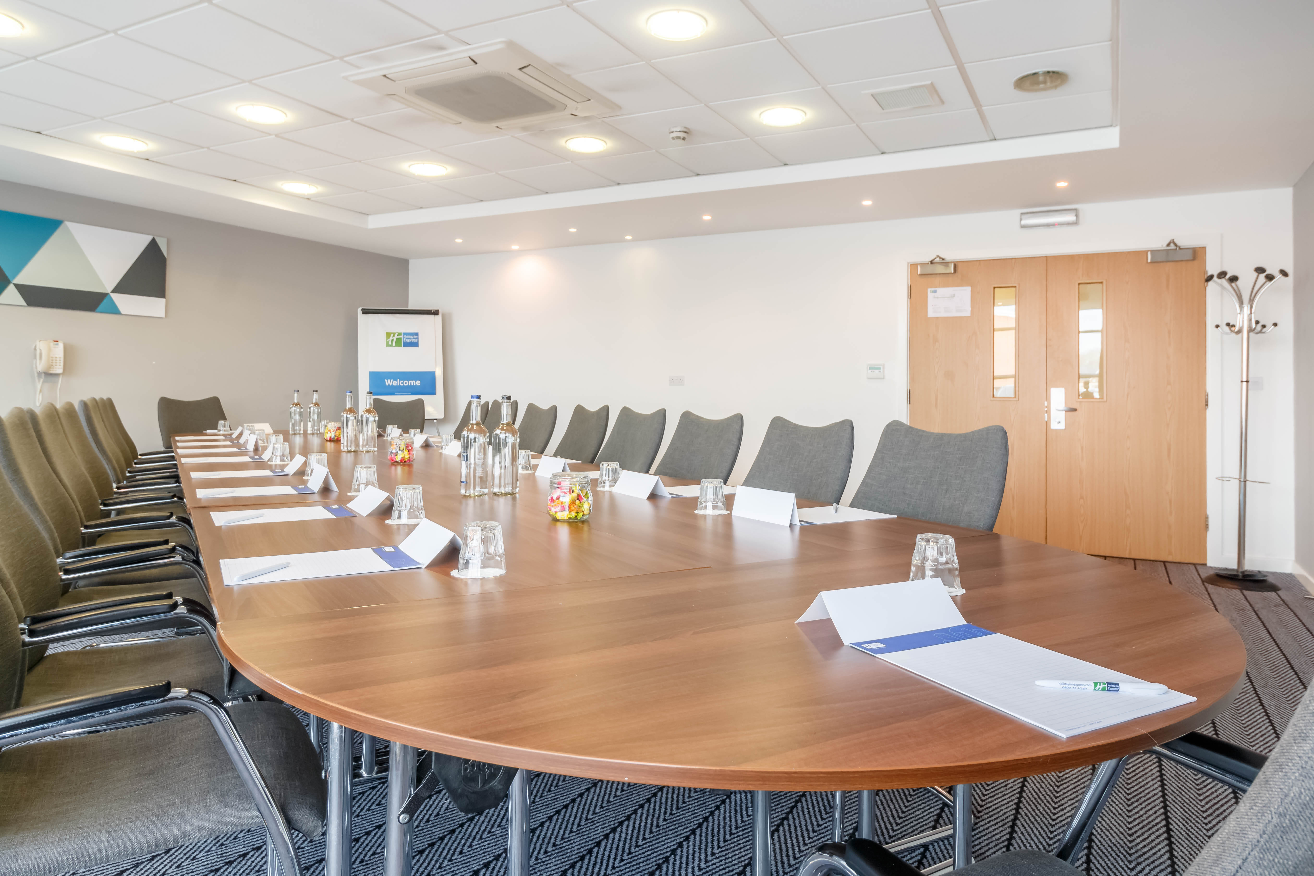 Modern meeting space with in built AV equipment max capacity 150, room splits into 2.