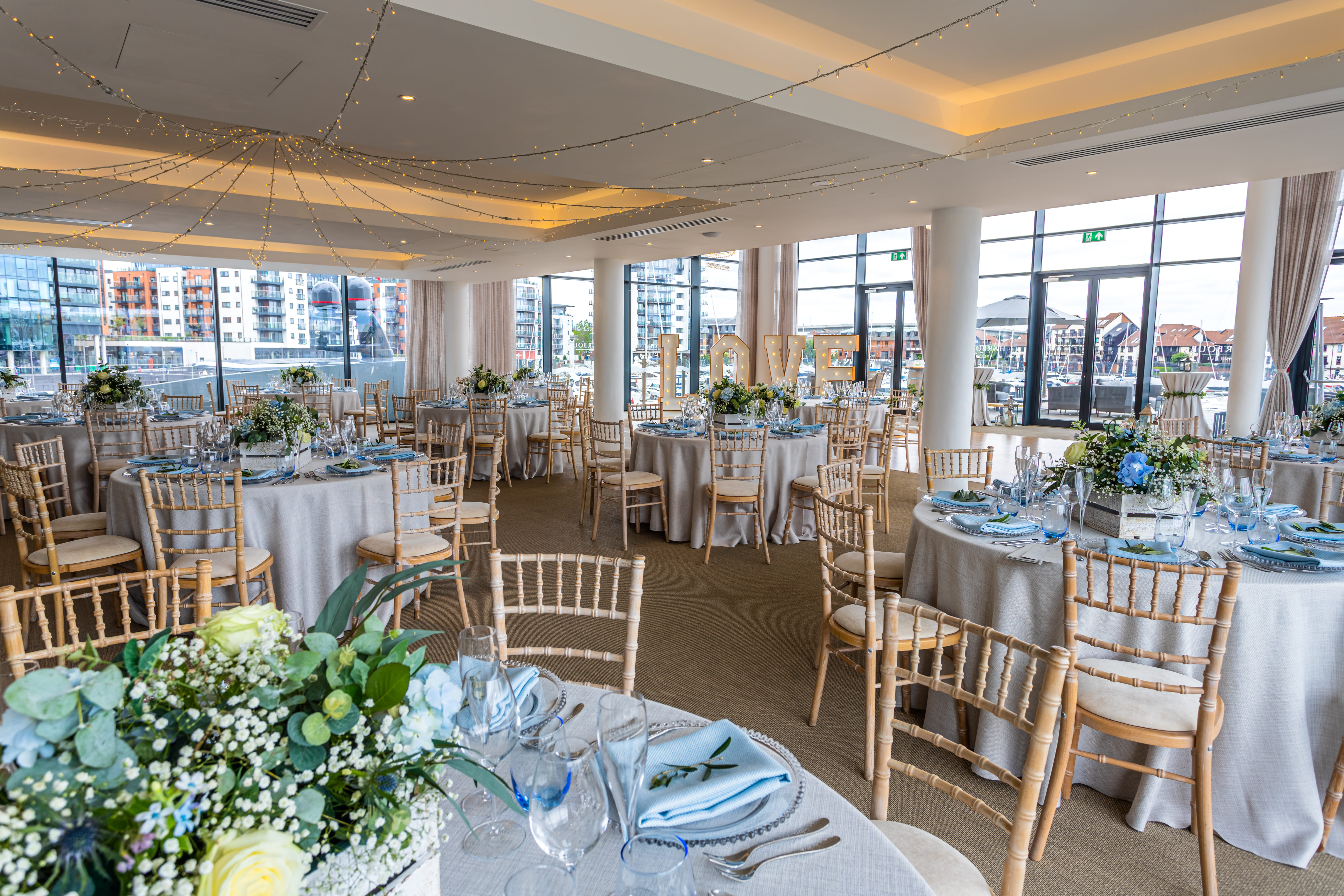 This large and impressive first-floor event room features floor-to-ceiling windows, spectacular sparkling chandeliers, and panoramic views of the marina and Solent seascape. It is ideally suited to large conferences, receptions, and events.