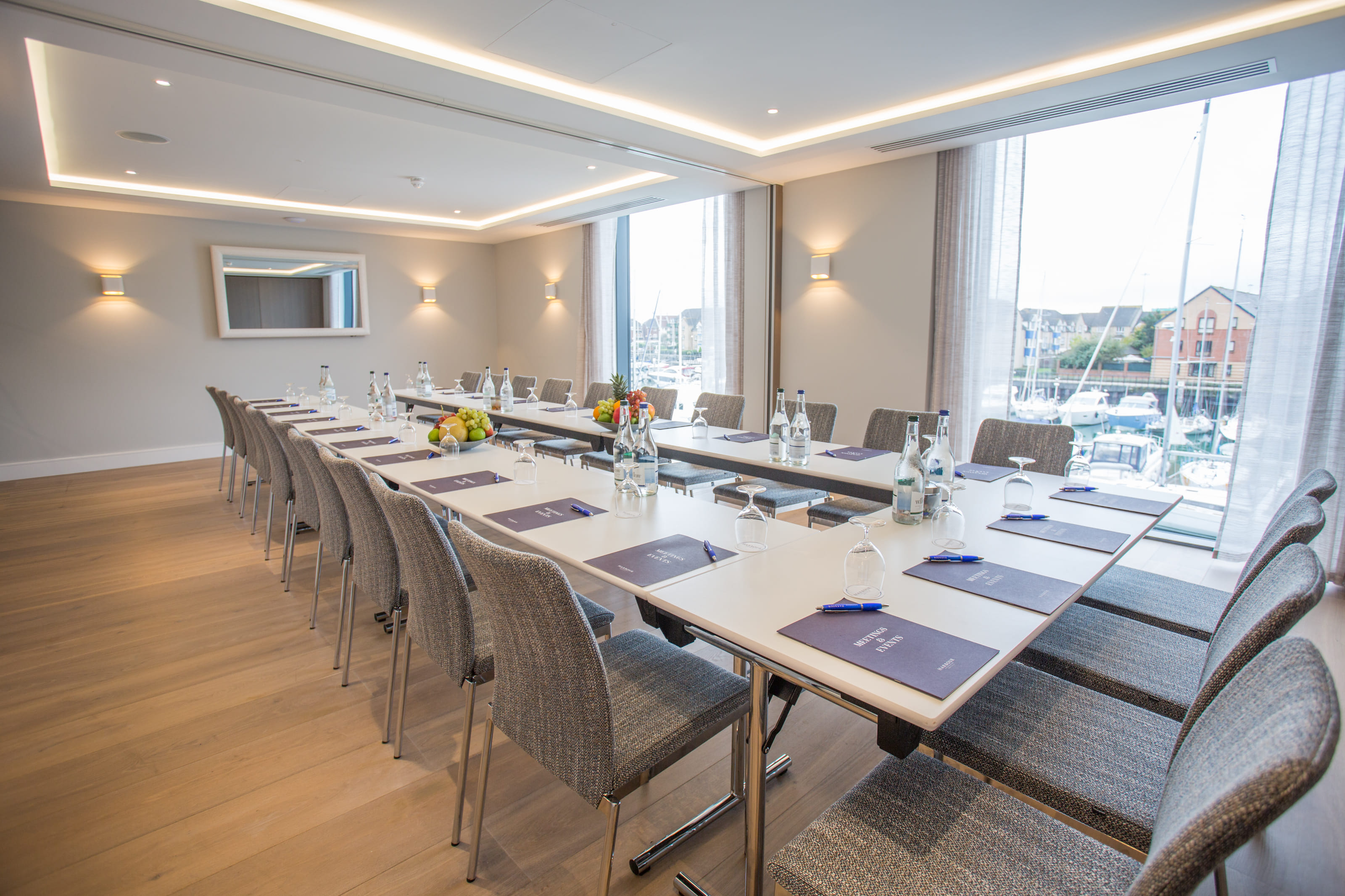 ‘The Needles’ features floor-to-ceiling windows and views of the marina and Solent seascape. It is ideal for conferences, receptions, and events. It may also be subdivided into four sections for smaller events.
