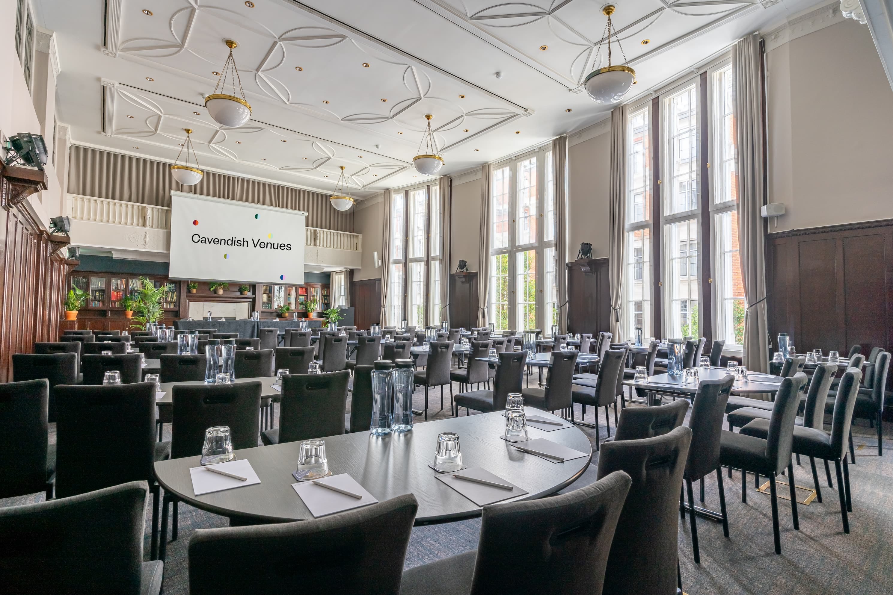 A traditional room with wood panelling and high ceiling, as soon as you step inside you would be travelling back in time to when it was used by the General Medical Council over 100 years ago.