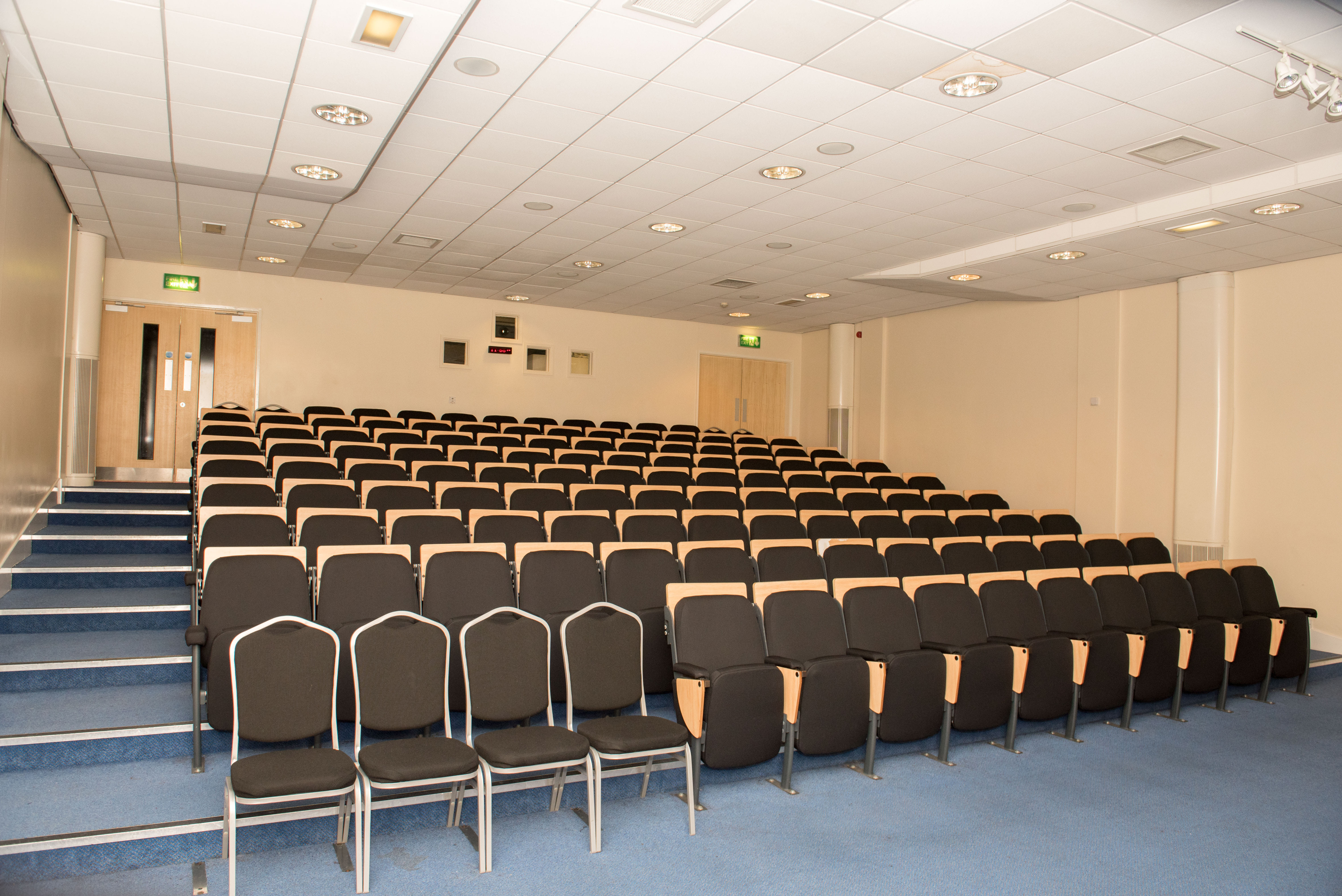 A tired theatre with a large built-in TV and speaker system and lectern in the city centre of Manchester.