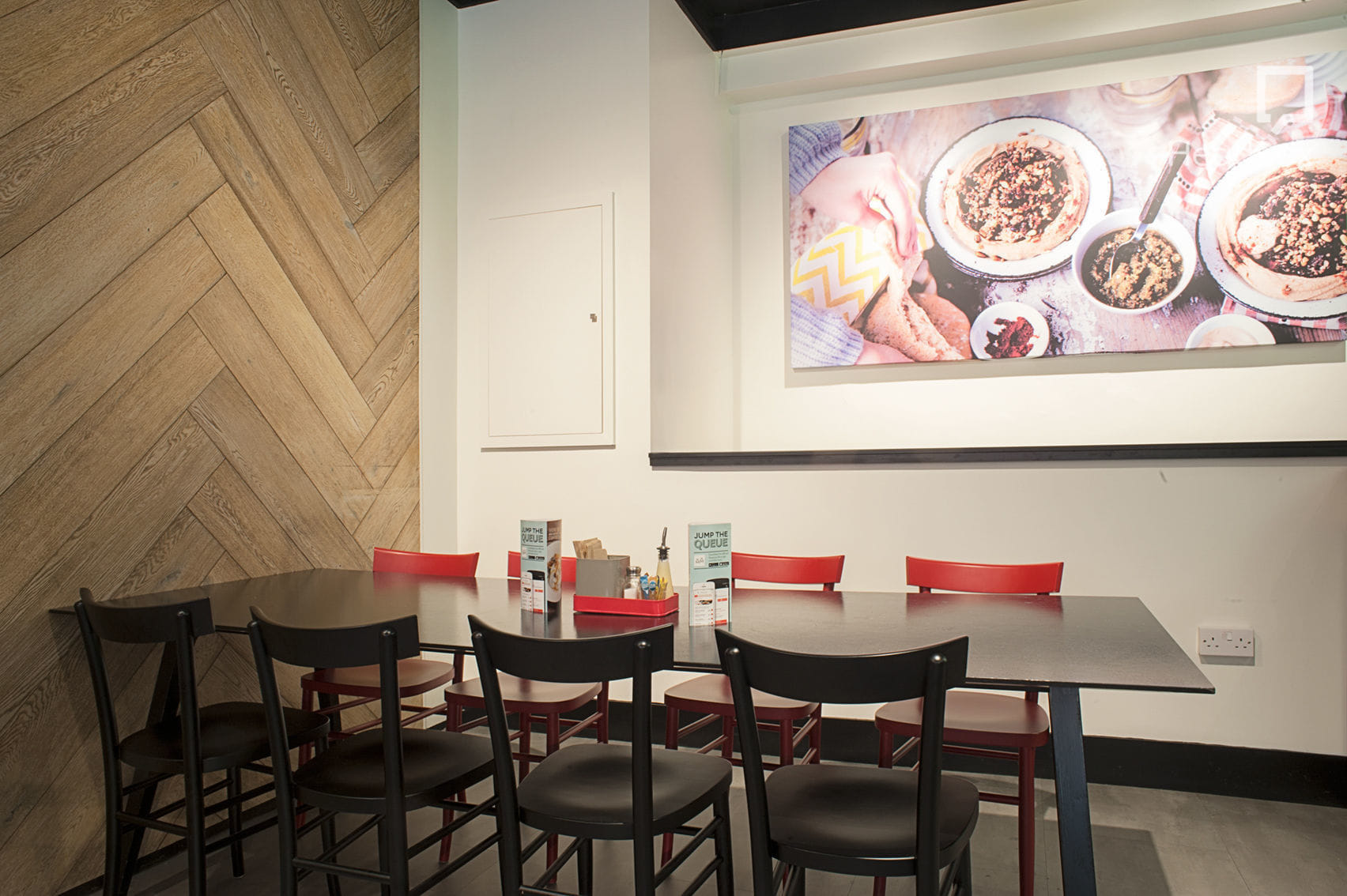 If you’re looking for unique meeting venues in London, Hummus Bros Exmouth Market offers a creative meeting space for hire. This branch of the ever popular Hummus Bros is located in the heart of Exmouth Market. Exmouth Market is a bustling and vibrant street in the middle of the creative area of Clerkenwell. This venue is well-suited for casual evening meetings. It is the ideal creative meeting space, with its large tables and bright lights and modern decor. The atmosphere is relaxed, sociable and creative and will be inspiring and energising for your event. This Space at Hummus Bros Exmouth Market is perfect for productive meetings, accompanied by a healthy and fresh dinner. For groups of 20 people and above the restaurant will be closed for the regular service. Special offer: The price per day fee includes the option of the venue’s mediterranean buffet, offering a selection of fresh salads, falafels, hummus, as well as pitta bread and a drink for only £5 per head. Additionally, the venue recommends Borough Wines next door with regard to the BYO option.