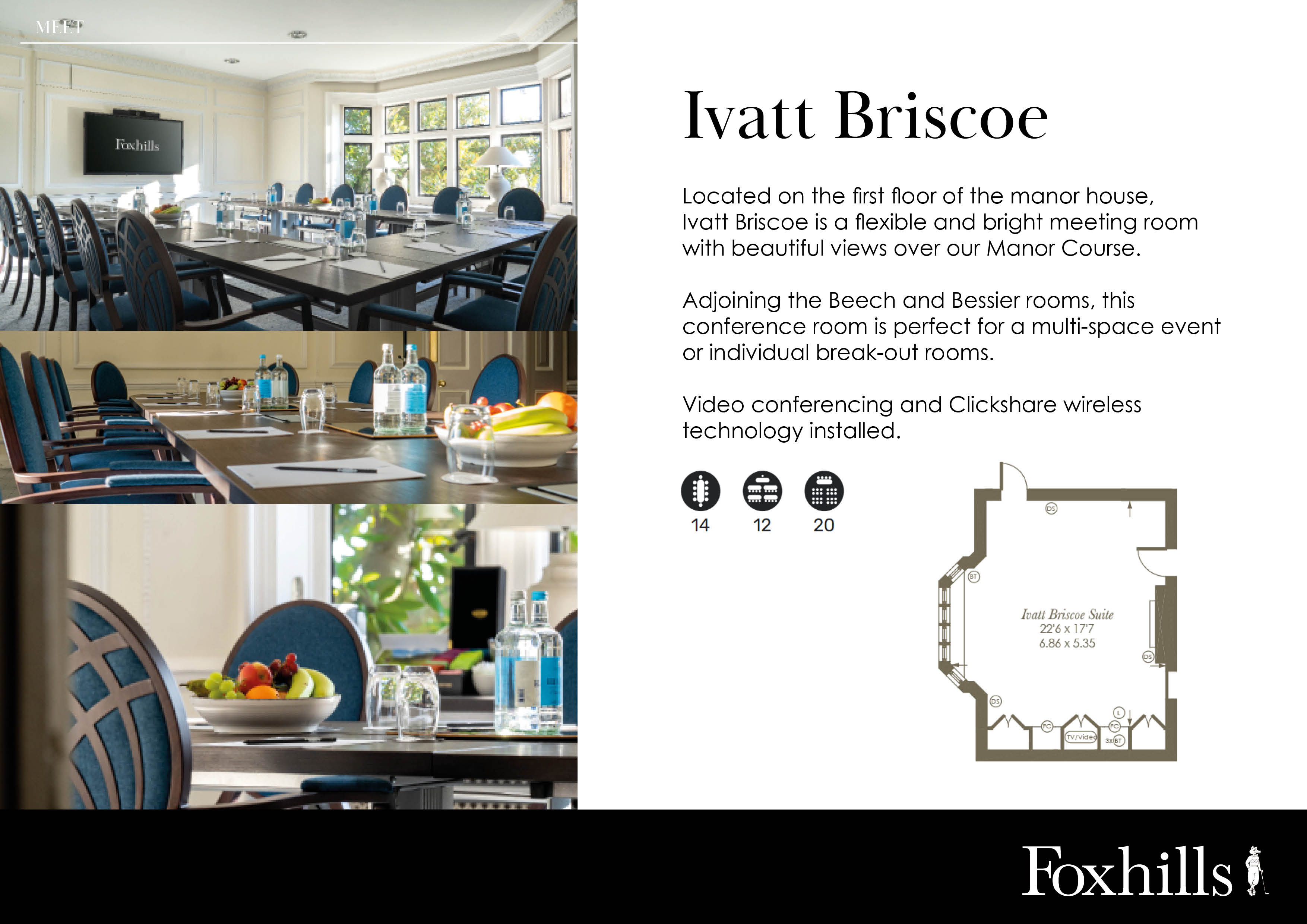 Located on the first floor of the 19th century Manor House, the Ivatt Briscoe room provides exquisite views across the nine hole Manor golf course. Decorated in neutral tones, this room can accommodate up to 20 people theatre style, 16 in a u-shape or up to 14 in boardroom style. Video conferencing equipment and clickshare wireless technology now installed.