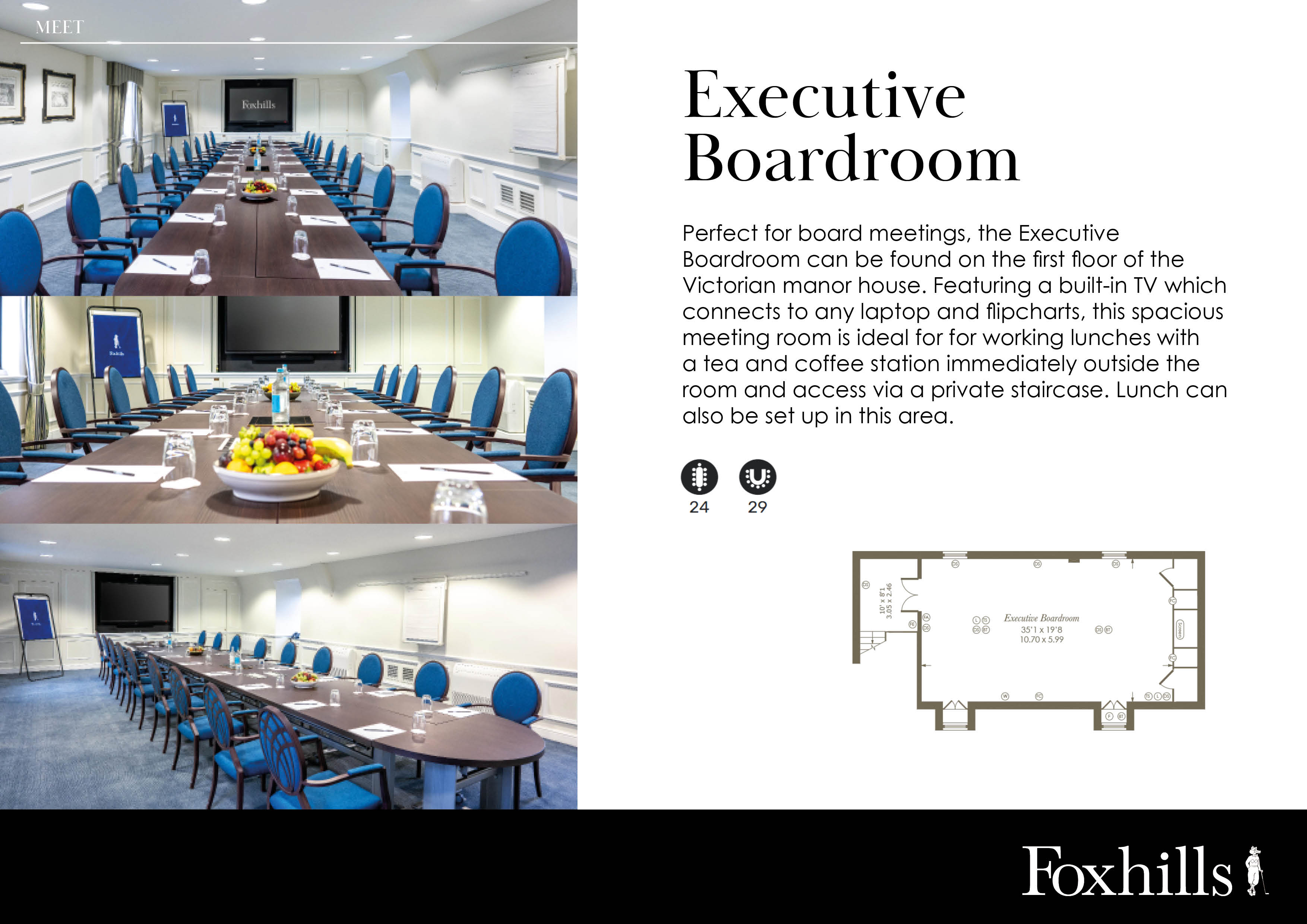 Located on the first floor of the 19th century Manor House, the Executive Boardroom holds up to 26 people for a board meeting or up to 28 in a U-shape style. Featuring a built-in TV which connects to any laptop and flipcharts, this spacious room is ideal for working lunches with space for a separate tea and coffee station located outside the room and private lunch station can beset-up at the bottom of the room’s private staircase.
