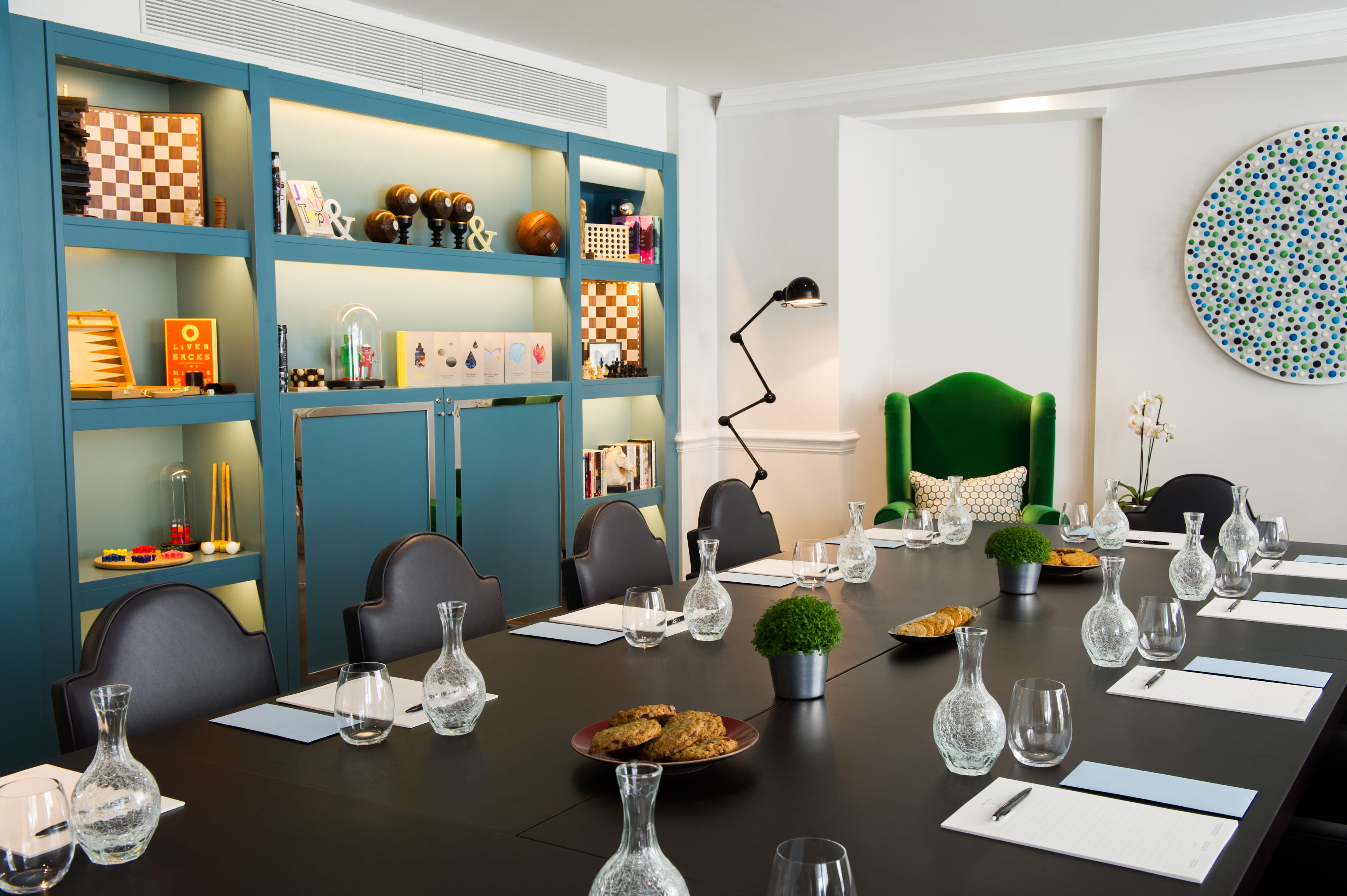 This colourful room, lined with bookshelves full of quirks and curiosities, is the largest of our meeting spaces, ideal for birthday celebrations, cocktail receptions or large meetings for up to 32 seated or 50 standing. We are following government guidelines closely – so we wanted to make clear that we can still accommodate private business meeting & weddings celebrations up to 15 people in our Games Room. The Games Room is a continuation of The Ampersand’s playful, quirky style. Kingfisher blue bookshelves are full of curiosities, games and books to wile away afternoons. The creative design lends itself to brainstorming meetings and free-thinking sessions, while the large size makes it a great choice for children’s birthday parties. We can also bring in our full-size ping pong table for special events or to let off some steam after meetings. As with every Ampersand experience, the layout of the room can be personalised to suit your event. To book: T: +44 (0)20 7591 4706 E: events@ampersandhotel.com