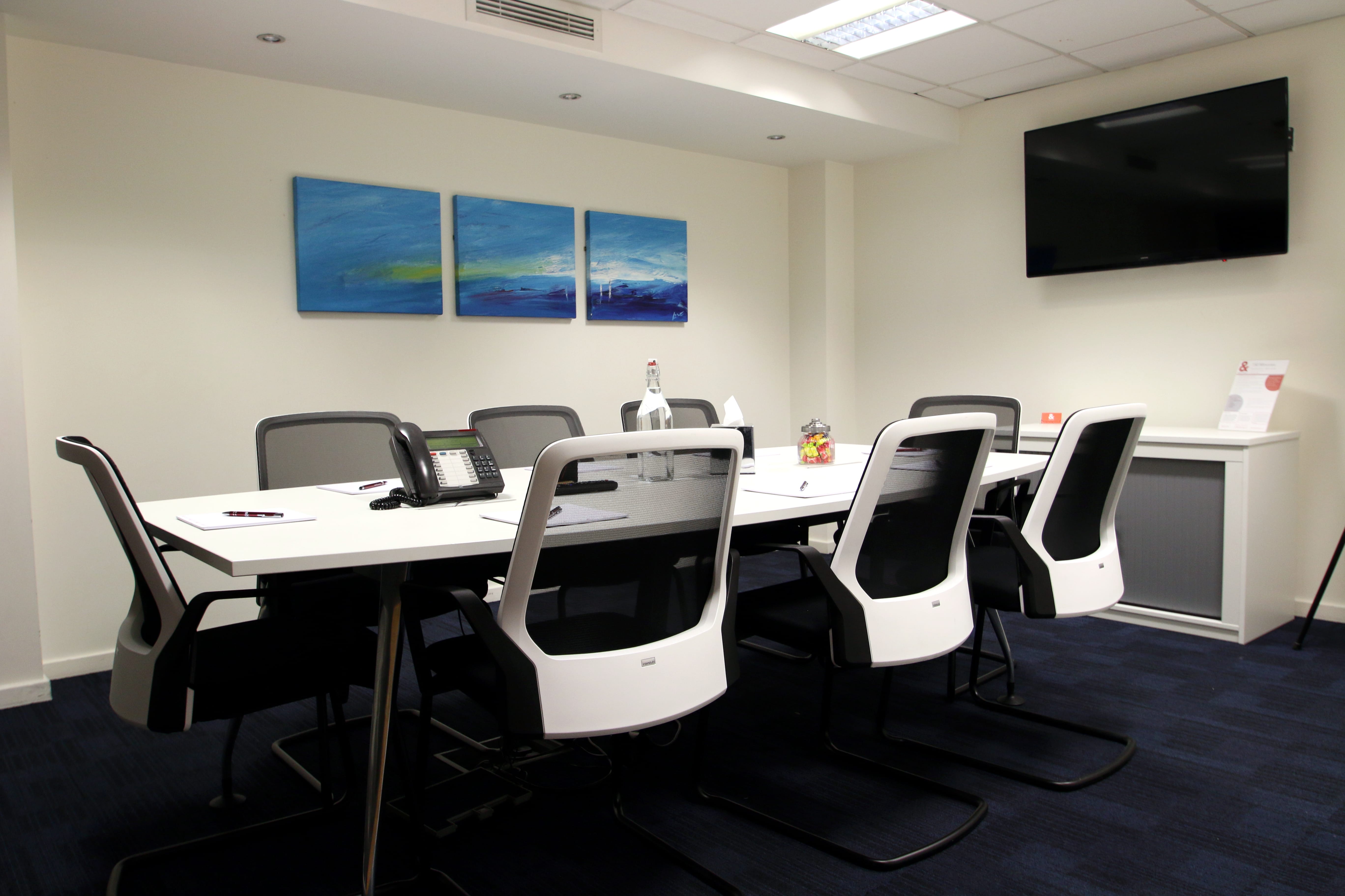 Seats up to 8 people AV equipment included Unlimited tea, coffee and water included Secure WiFi Telephone Catering options available